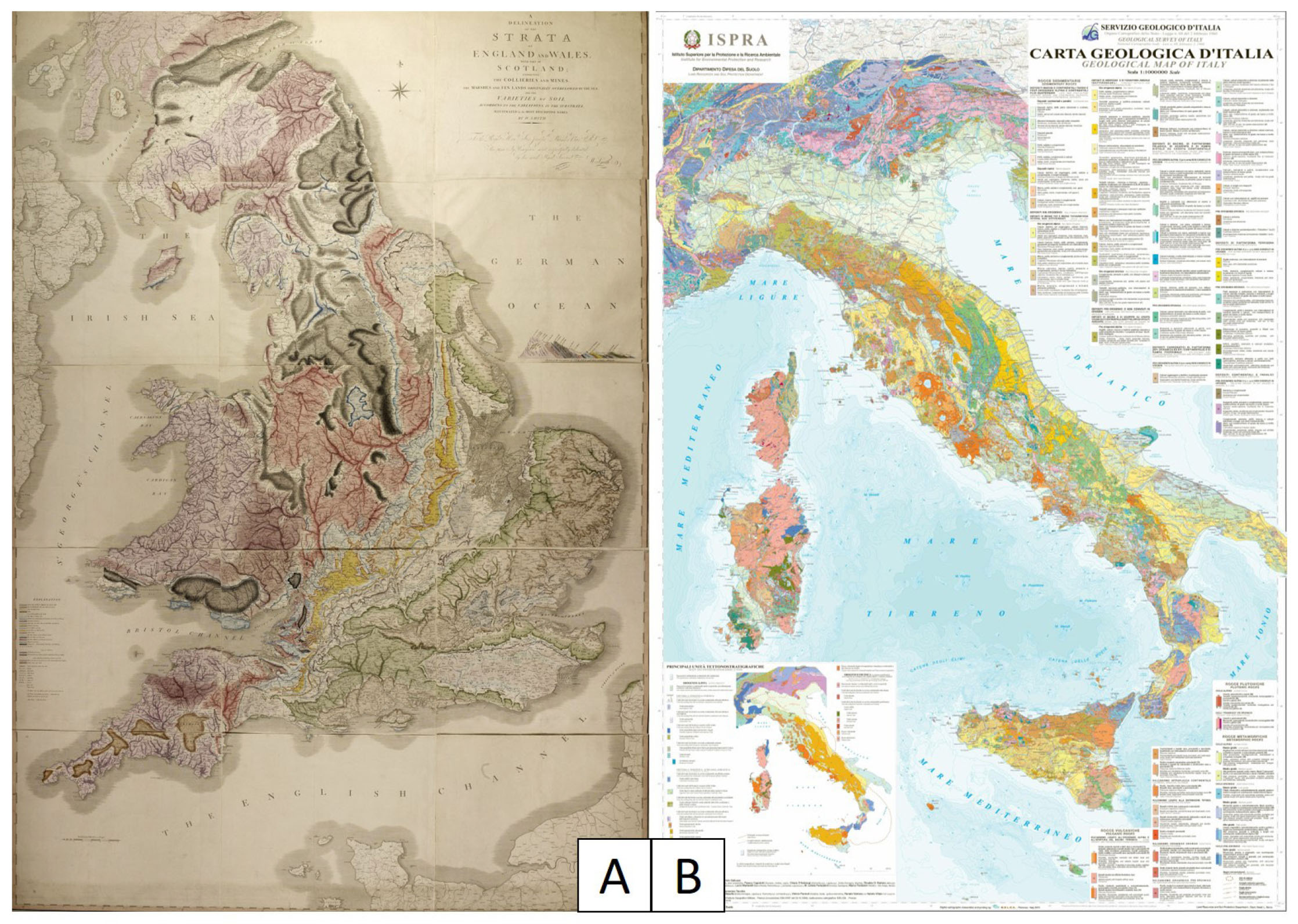 - William Smith’s 1815 geological map (A) and the 2011 geological map of Italy (Servizio Geologico d’Italia, 2011a) (B): geological knowledge and data resolution has changed, but the basic concepts still remain the same. Despite the difference in details, both the maps report the geological data with colour and the description of the units, organised according to their age, is provided by a coloured legend.
