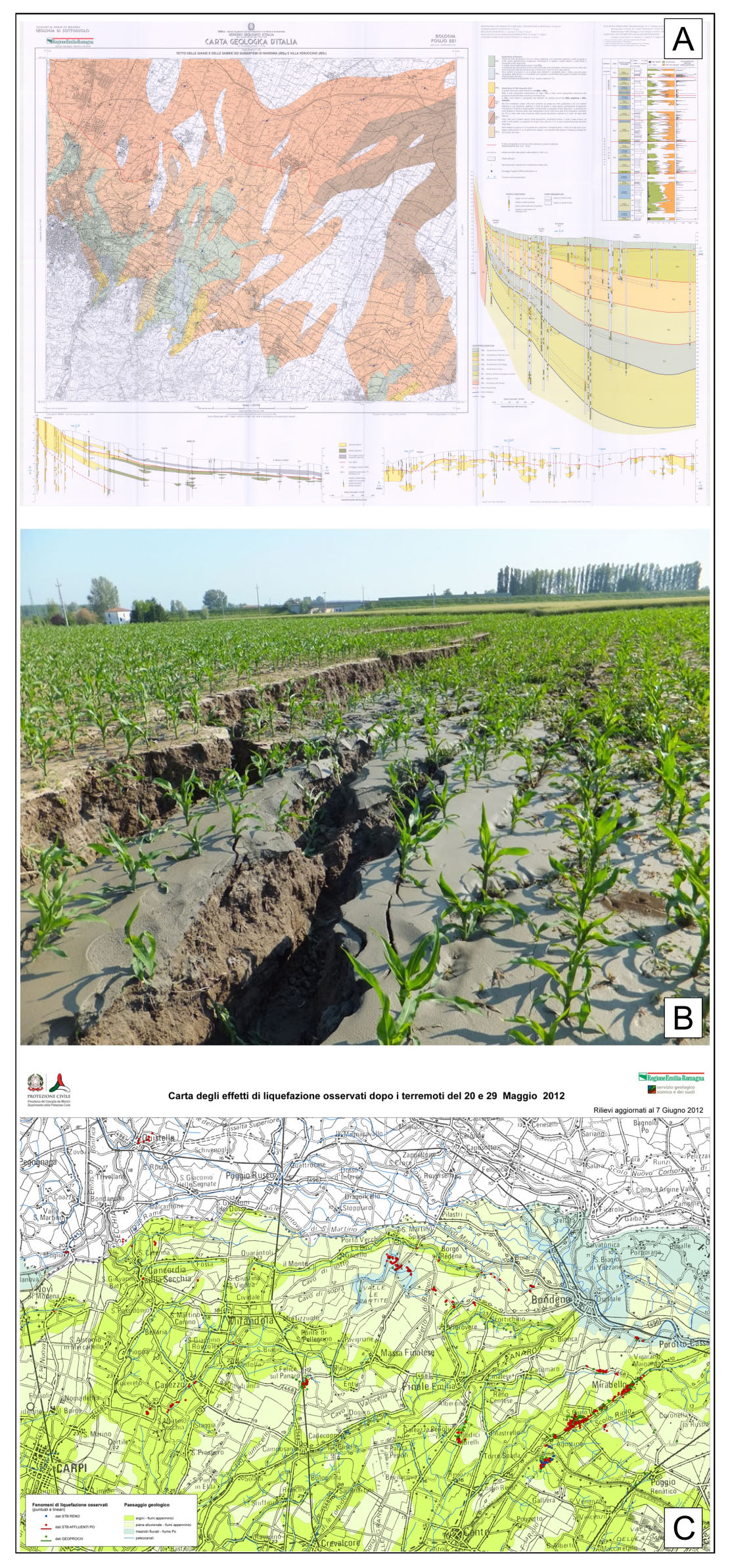 - A) Subsurface geological map enclosed to Geological Map of Italy 1: 50,000 scale - Sheet 221 Bologna (Servizio Geologico d’Italia, 2009). Geological cross sections and schemes support the description of lateral variations of the Quaternary deposits; B) soil liquefaction effects observed near San Carlo after the earthquake (May 2012, photo: P. di Manna - ISPRA); C) map showing the position of soil liquefaction effects (coloured dots) in relation to the distribution of levee and channel sands (Gruppo di Lavoro Liquefazione – Italian Civil Protection Dept. and Regione Emilia Romagna, 2012).