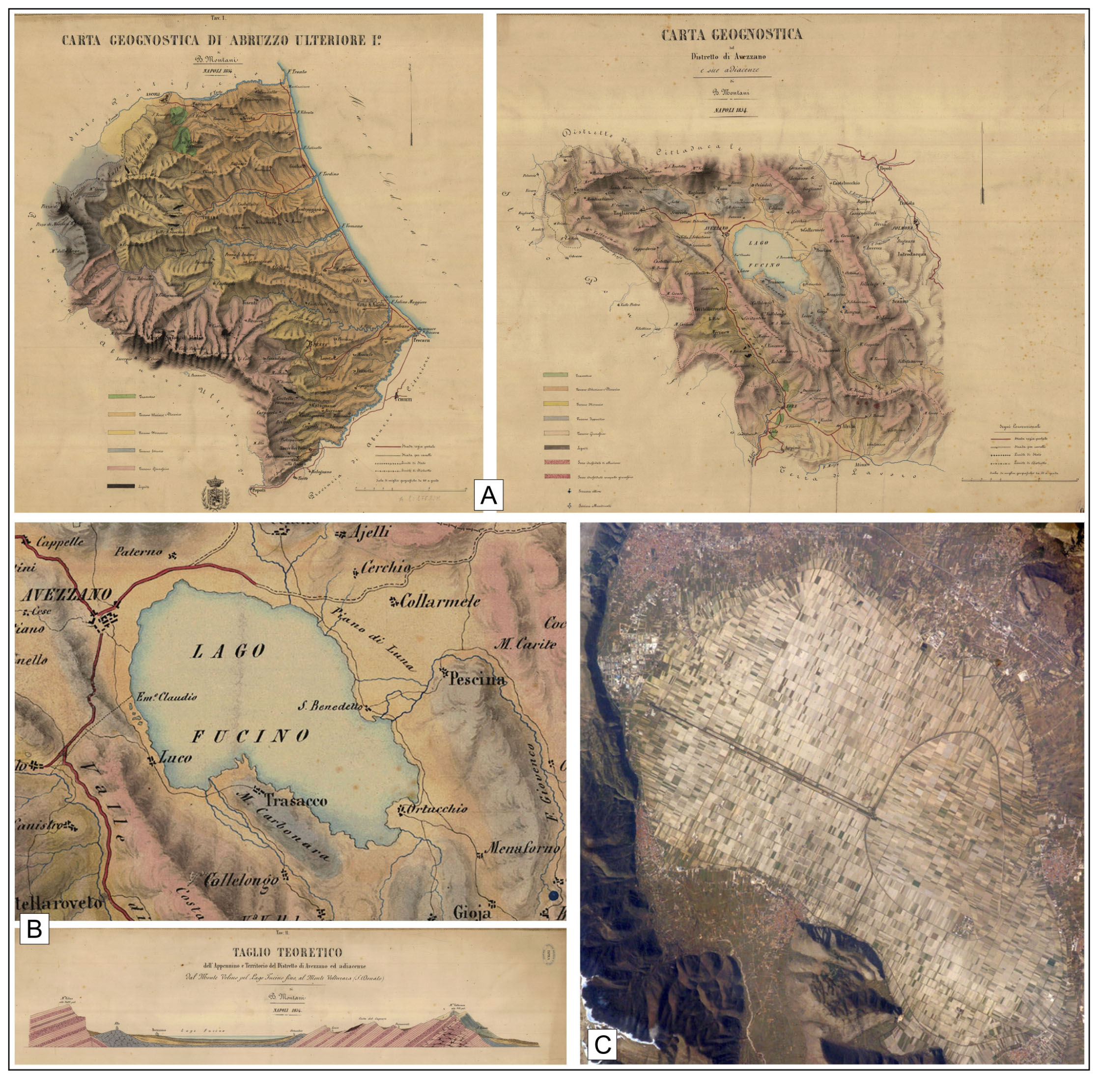 In its maps (Montani, 1854a, b) the rocks were distinguished mainly according to chronological criteria, coupled with biolithological details, and specific colours were used to identify the “resources” (e.g., lignite, iron, mines) (Fig. 11A). Montani’s maps represent not only a first attempt of regional geological mapping but also record the evolution of the area : the Fucino Lake, represented in the Montani’s map and cross-section (Fig. 11B), was artificially drained between 1855 and 1878 and now the area is a fertile plain (Fig. 11C).