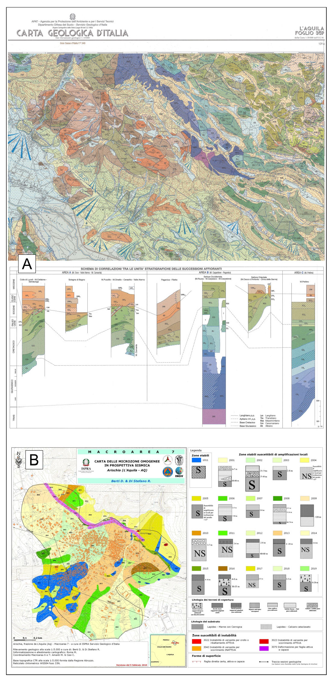 Although having a different goal, a well-done field survey at 1:10,000 scale realised for the Geological Map of Italy at 1:50,000 scale turns out to be a basic starting point for the 1st level Seismic Microzonation: thematic maps (Fig. 12B) are derived from the geological one to support the delimitation of areas with different susceptibility to seismic local amplifications.