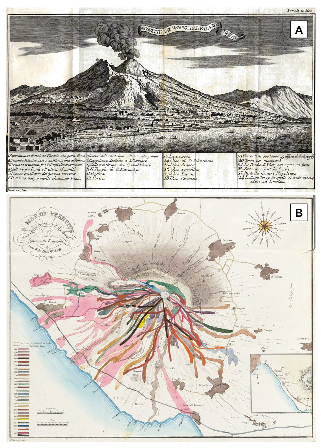 - A) View of Vesuvius from the Royal palace (1779) (Permission ISPRA library). B) Lava map of Vesuvius (Auldjo, 1832) - https://www.flickr.com/photos/bibliodyssey/5912896472