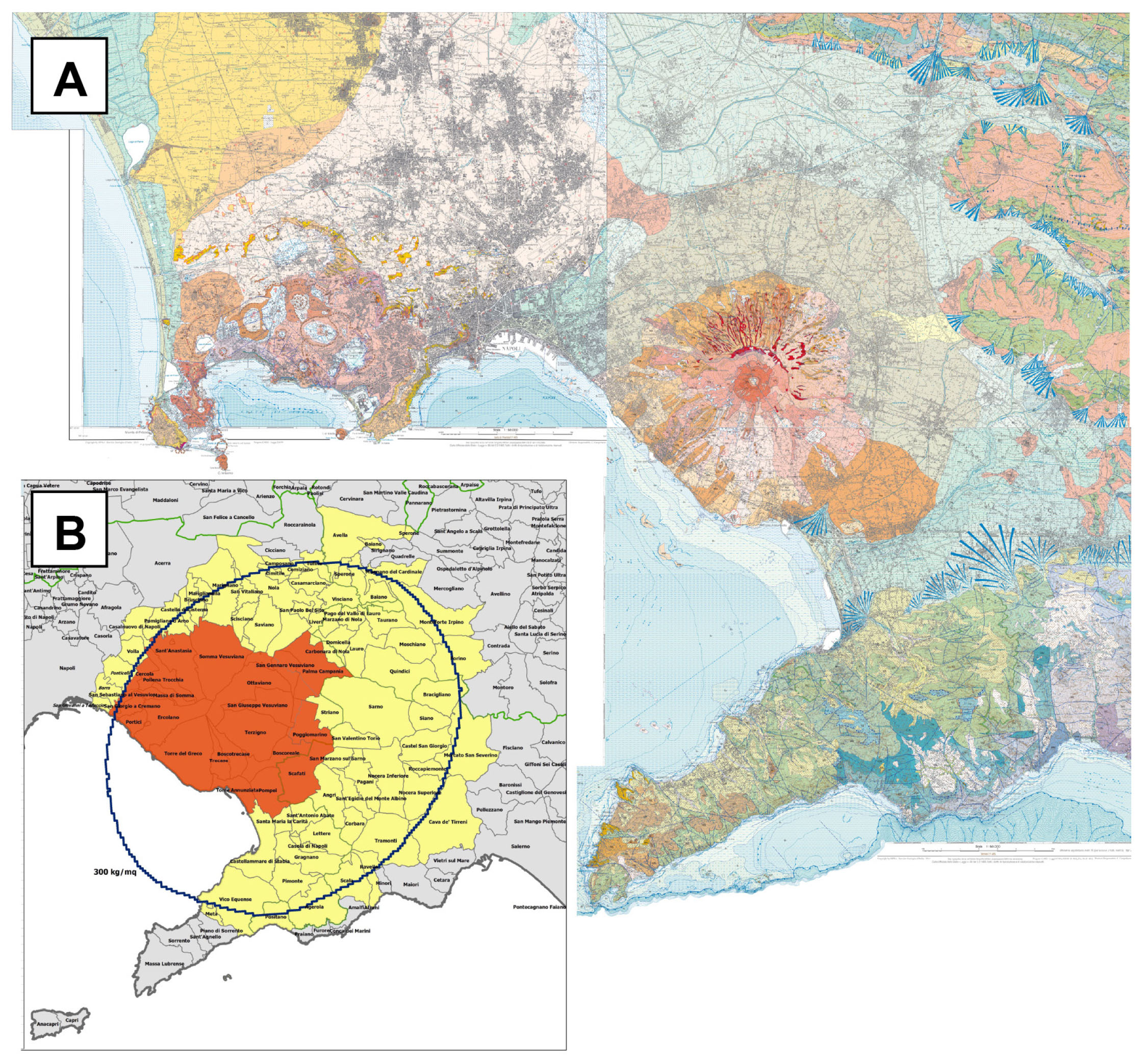 In the 2015, according to the distribution of volcanic products of Vesuvius, and moving from CARG geological data, the Italian Department of Civil Protection designed an emergency plan around Vesuvius that defined a red zone (the area that potentially could be involved by lava and/or pyroclastic flows) and a yellow zone (the area where buildings could collapse under an ash load of 300kg/m2) (Fig. 15B).