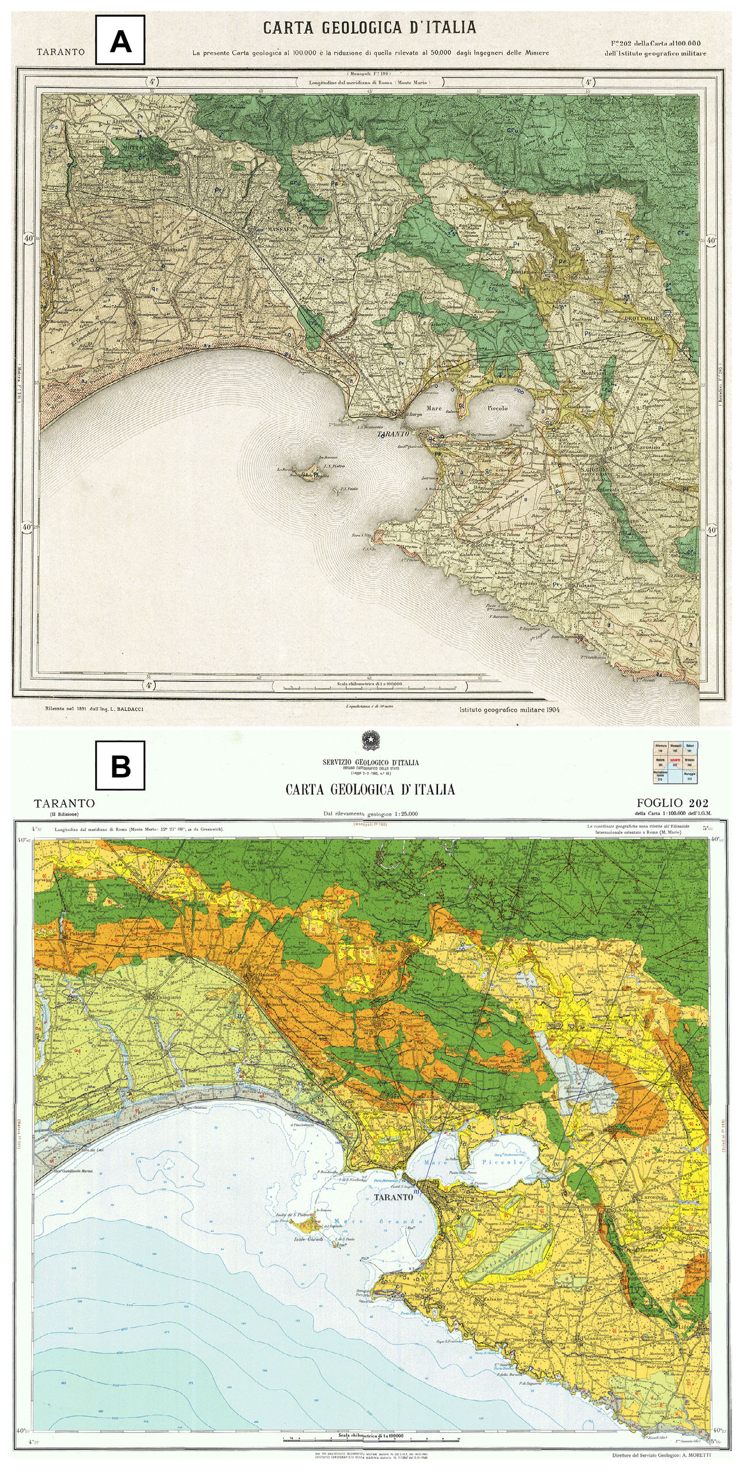 - A) First edition (1904) of the 1:100,000 Sheet 202 “Taranto” (Servizio Geologico d’Italia, 1904). B) Second edition of the same map (Servizio Geologico d’Italia, 1969).