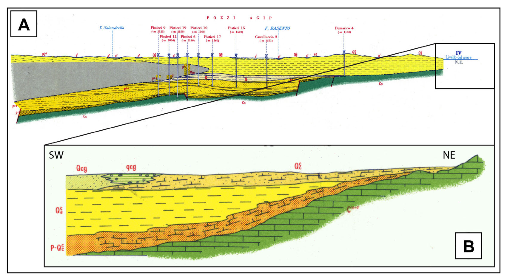 - A) First detailed regional section cutting the South-Appennines Foredeep (1:100,000 Sheet 201 “Matera”) B) Relationships between the Cretaceous bedrock and the Plio-Pleistocene deposits on the eastern side of the same foredeep in the Taranto area (1:100,000 Sheet 202 “Taranto”).