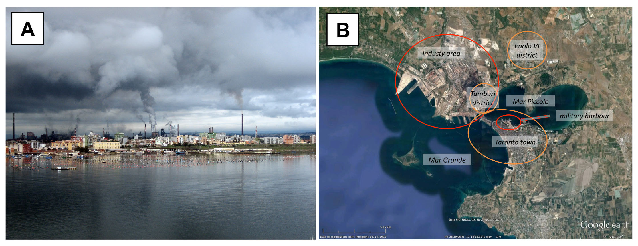- A) The industry area of Taranto (https://commons.wikimedia.org/wiki/File:ILVA_-_Unit%C3%A0_produttiva_di_Taranto_-_Italy_-_25_Dec._2007.jpg); B) location of the industries respect to the town districts (base map from Google Earth).
