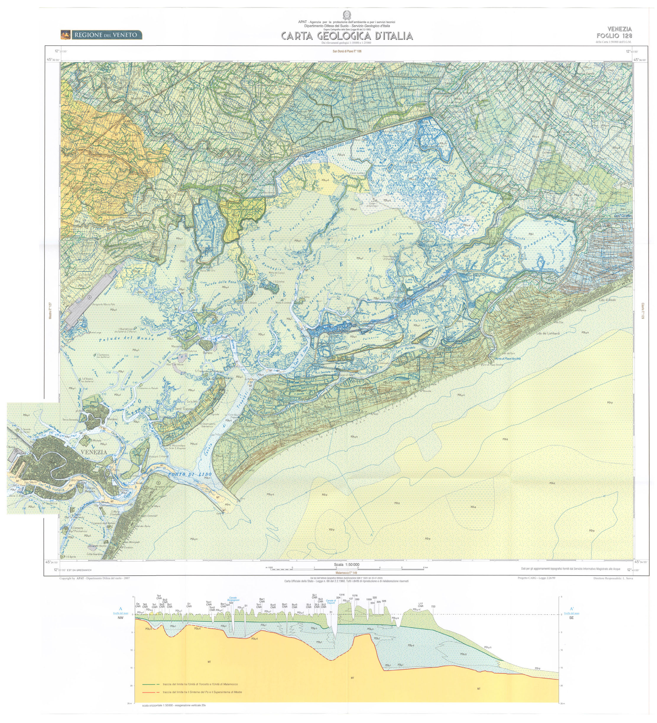 - Example of a new geological map of land (onshore) and submerged areas (offshore; Sheet 128 “Venezia”, Servizio Geologico d’Italia, 2007) recently realised within the 1:50,000 Italian official cartography (CARG) project.
