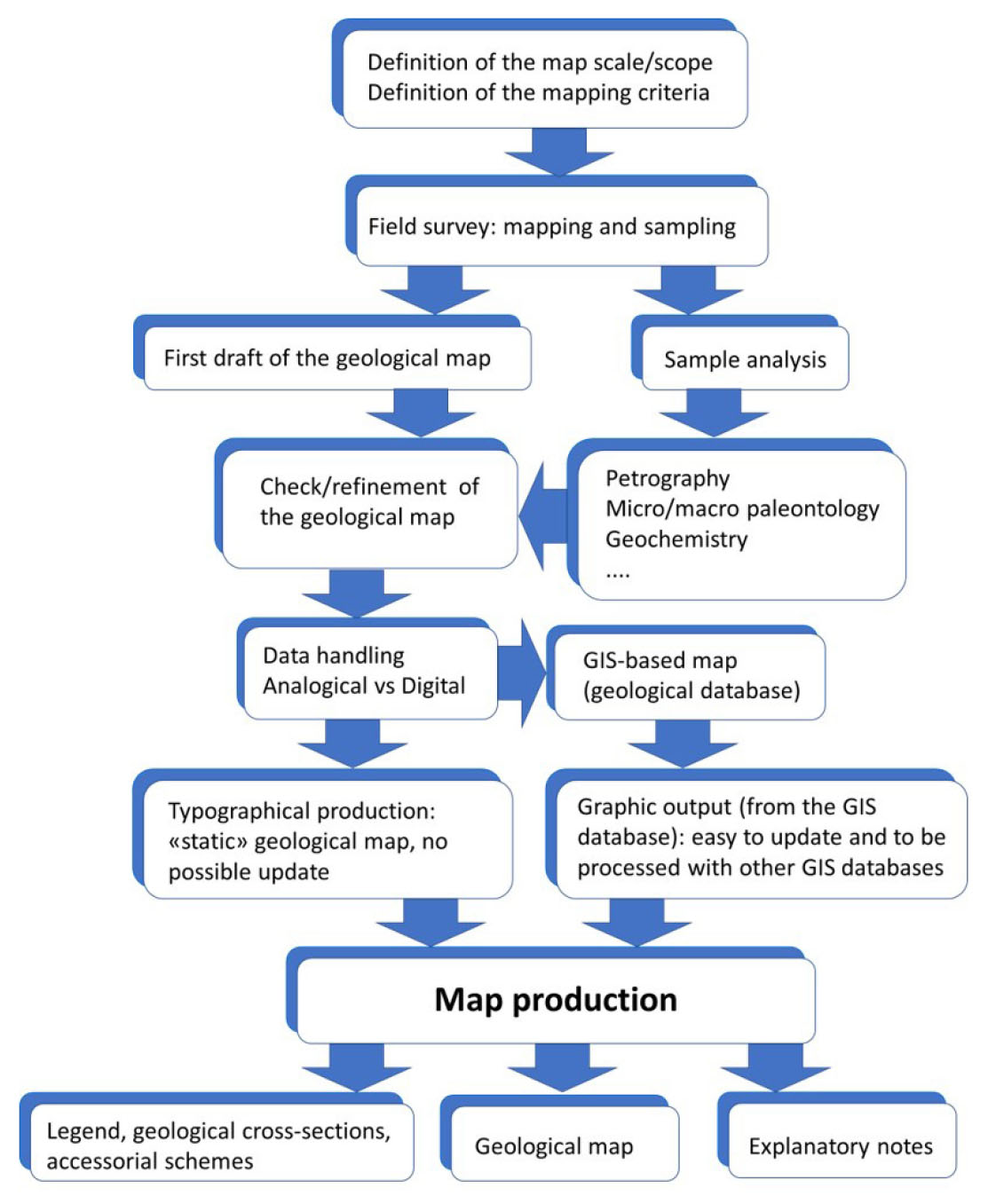 - Typical workflow for the production of a geological map, with digital storage of the field data.