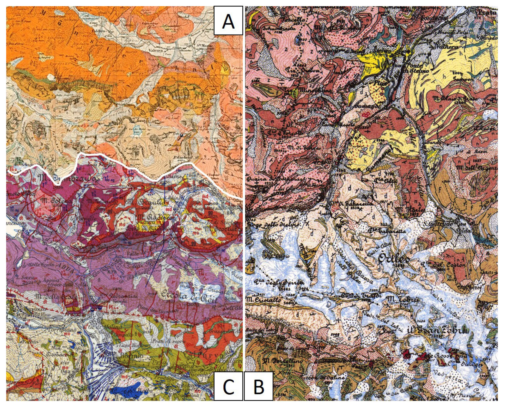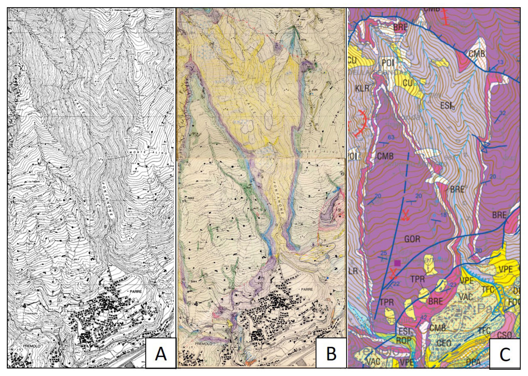 As geology is a “young” science (with respect to other classical sciences, such as physics or chemistry), the different generations of geological maps on the same area represent an update, in terms of details, data, and scientific improvement, of the previously existing maps. Geological maps need to be continuously updated, not, in general, due to changes in the local geology (that at the scale of human history remains stable, with the exception of catastrophic events such as landslides, earthquakes or volcanic eruptions), but to the improvement of the geological knowledge and the availability of new data (related to new investigations). Furthermore, beside the scientific improvement of geology, also the tools for geological data handling rapidly developed in the last decades: new geological maps couple the increased details and understanding of geological processes with digital tools for georeferenced geological data handling (typically GIS systems) and high-precision topographic survey tools (such as UAV, but also Lidar and other remote-sensing technologies).
