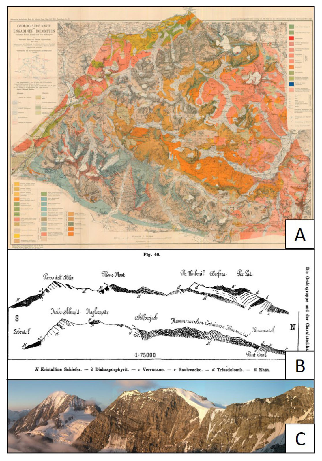 - Geological map realised by Spitz and Dyhrenfurth (1914), one of the oldest detailed geological maps on part of the Alpine chain (A; Permission ISPRA library). The geological map benefitted from previous studies focussed on the understanding of the stratigraphic and tectonic studies, such as that by Hammer (1908) who represented the limestone intercalations (B) in the Hauptdolomit succession of the Ortles Nappe, that can be clearly observed in the picture underneath, from the summit of the Ortles (C).