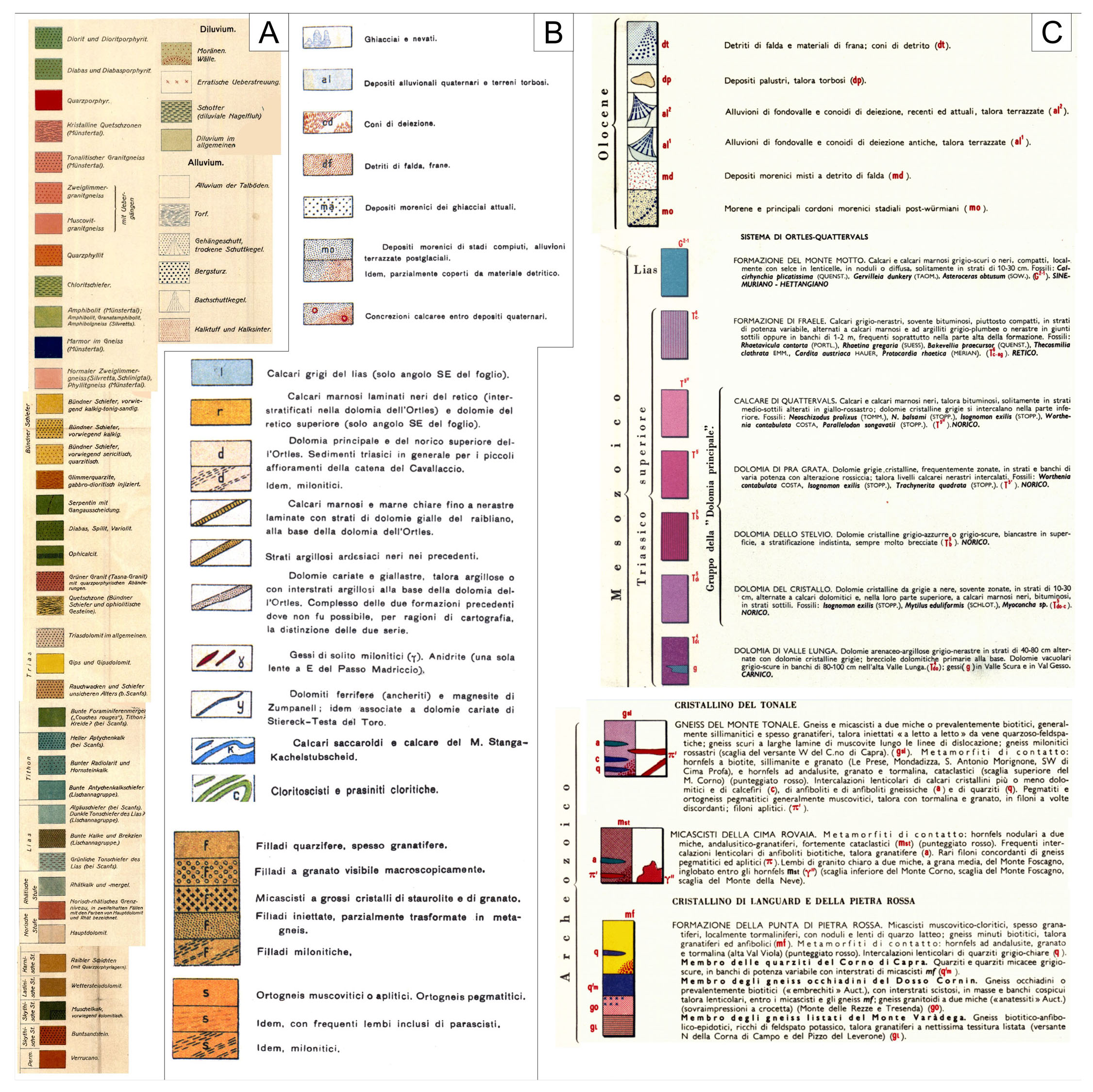– The legends of three geological maps (A: Spitz & Dyhrenfurth, 1914; B: 1:100,000 geological map Sheet 09 Cevedale (Servizio Geologico d’Italia, 1951); C) 1:100,000 geological map Sheet 08 Bormio (Servizio Geologico d’Italia, 1970) highlight the different detail in the definition and description of the mappable units, reflecting the continuous improvement of the knowledge of the geological processes and of the analytical tools usable for the characterization of rock bodies.