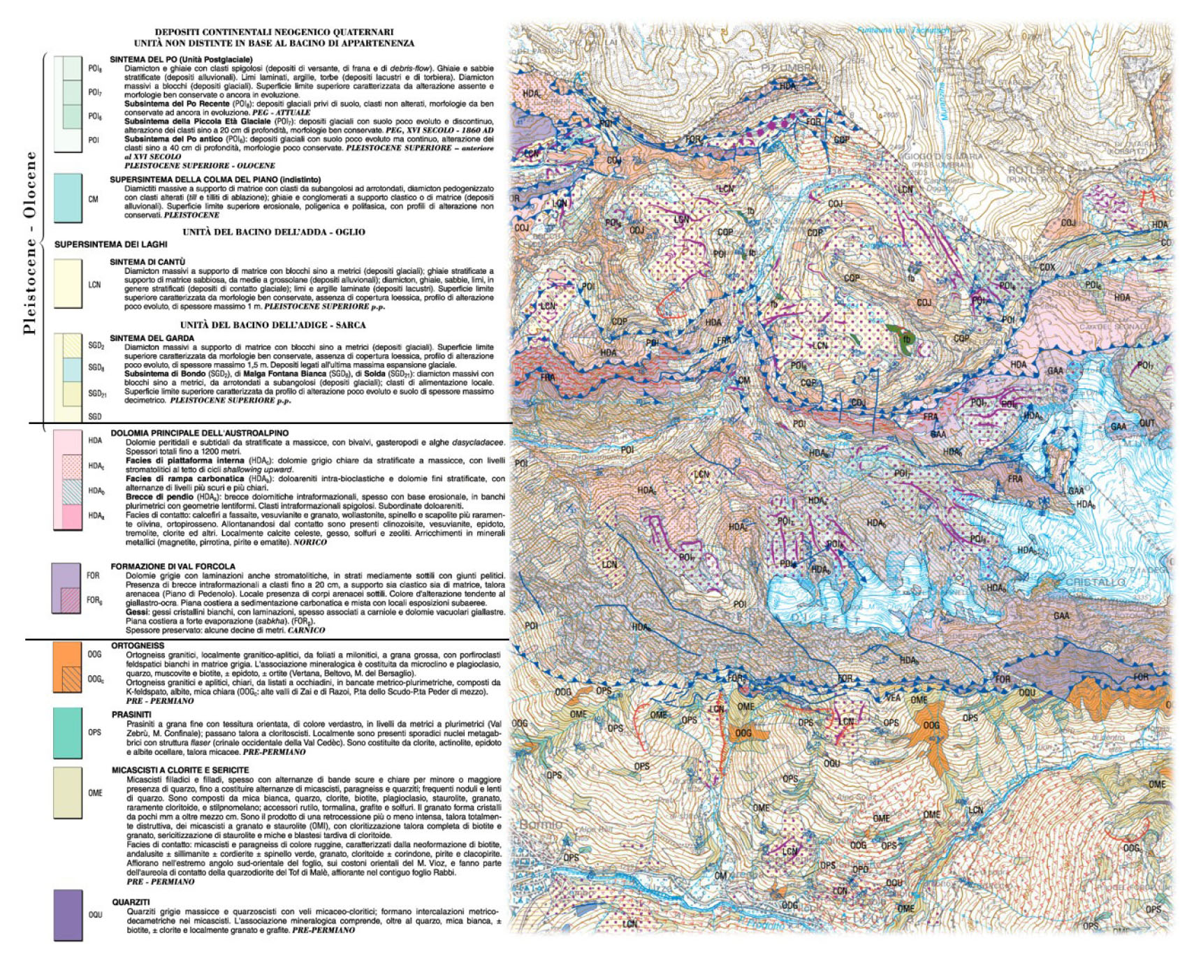 A geological map is a thematic map describing the type of rocks that outcrop at the surface of the Earth. Geological maps show the anatomy of a territory, reporting rocks, recent deposits and their relationships, even by deducing their distribution below forests, soils, and urban areas. The distribution of rocks and geological deposits on the Earth’s surface provides essential elements to reconstruct their distribution at depth. The rocks are represented with different colours, one for each type; line symbols represent different types of contacts among rocks; point symbols indicate specific observations or features of small size. The legend is the key to the colours, patterns and symbols and is fundamental for understanding the information stored in the map. Geological data are reported on topographic maps, so that the user can “read” both the shape of a territory (topographic map) and the distribution of rocks in it (coloured polygons). Geological maps are thus three-dimensional physical objects (actually, a fourth dimension, time, is implicitly represented by the nature, age and relationships of geological bodies and processes that can be “read” with basic geological knowledge from a geological map): the intersection between geological boundaries and the topographic surface (represented in the maps by contour lines) provides geometric constraints on the relationships among different rock bodies, helping the geologist in predicting the subsurface geology. The three-dimensional nature and use of geological maps are further demonstrated by the common presence, in the map itself, of geological cross-sections, which help the reader in understanding the subsurface geology.