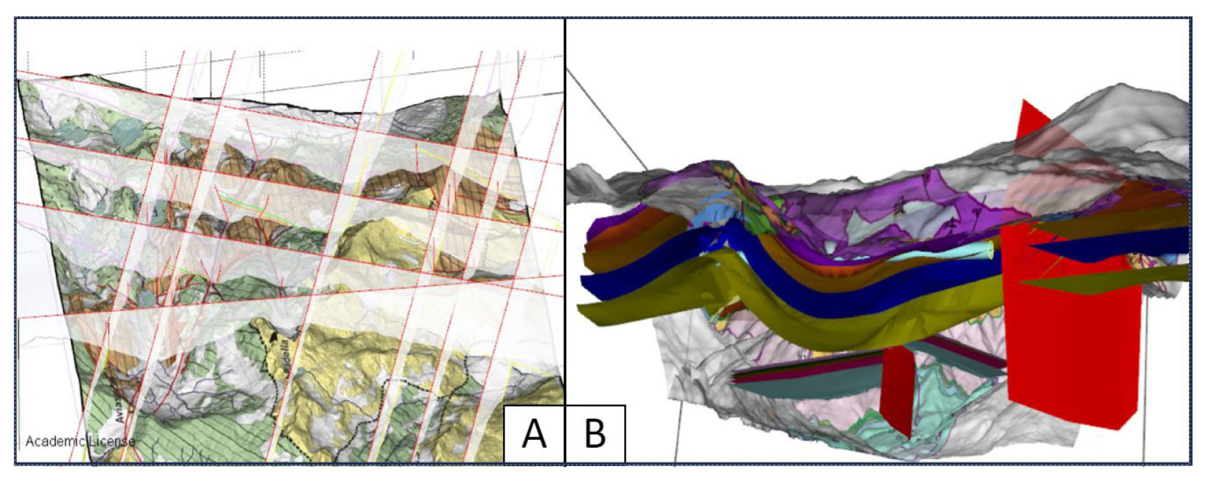 – Examples of the potential of digital geological maps to provide constraints for 3D modelling. In A) it is possible to identify the network of geological cross-sections required to constrain the geological model and to reduce arbitrary forcing of the model; in B) a 3D geological model with the reconstruction of the subsurface geometry of geological bodies, starting from surface data.