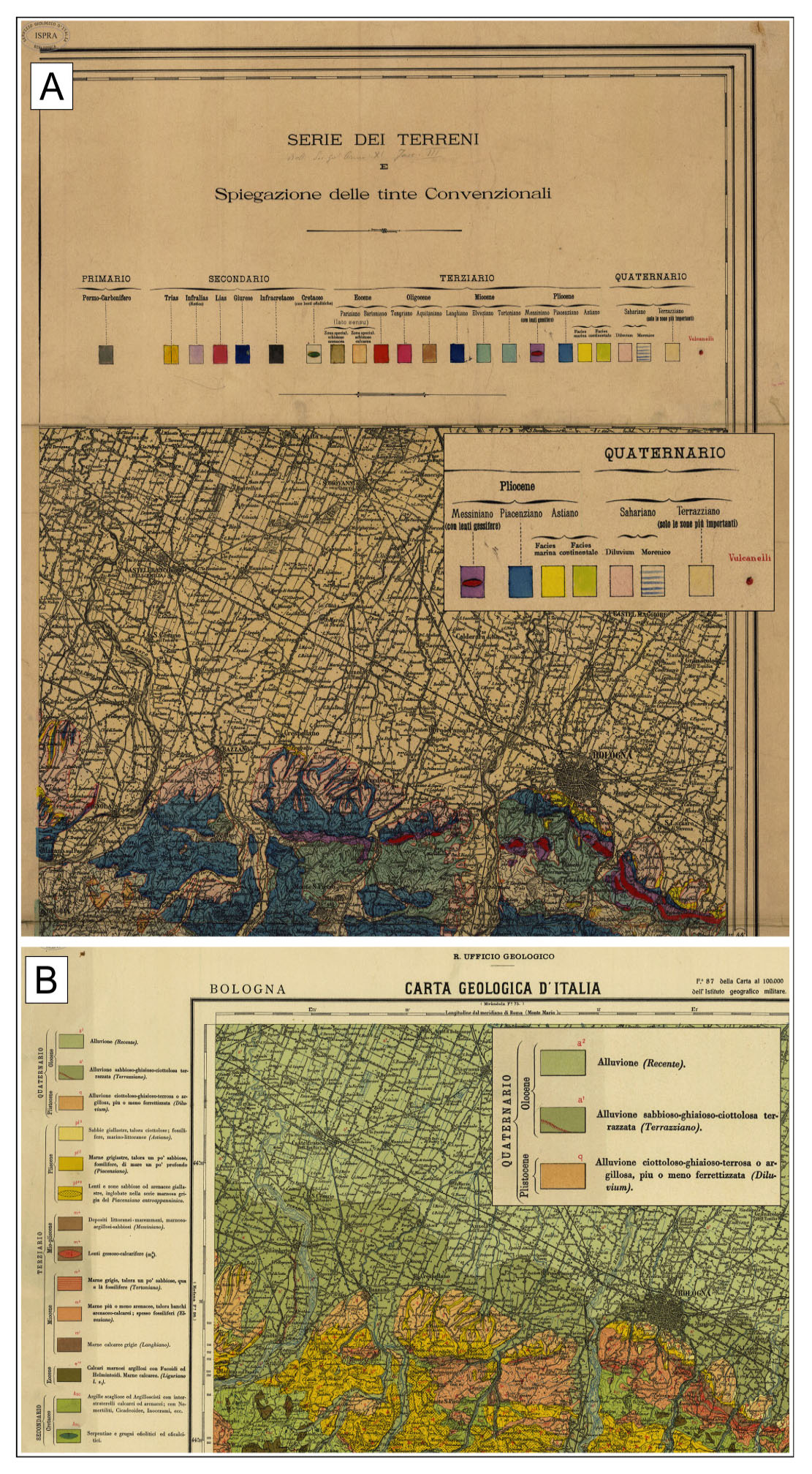 Forty years after his first field work and map, Federico Sacco mapped again the same area for the production of the first edition of the Geological Map of Italy at 1:100,000 scale (Sheet 87 “Bologna”; Servizio Geologico d’Italia, 1932; Fig. 9). Sacco added new field information with respect to its previous cartographic product (i.e, Sacco, 1892): in particular (Fig. 9B), the Quaternary deposits were subdivided into a larger number of units and “modern” chronological terms, such as “Pleistocene” (“Plistocene” in the legend) and “Olocene”, were adopted.