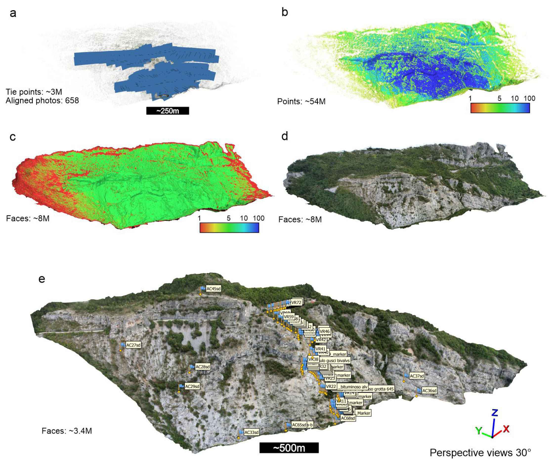 The aerial photographs were processed in Agisoft Metashape software to build the virtual outcrop model of the northern side of the Val Rosandra gully. The well-known workflow of Metashape (Verhoeven, 2011; Tavani et al., 2014; Carrivick et al., 2016) involved the high-accuracy alignment of the photographs followed by an iterative gradual selection filtering and camera optimization steps leading to a final Tie-Point cloud made of ~3M points (Fig. 3a). The medium-quality densification returned a dense cloud made of ~54M points that were also filtered based on point confidence (Fig. 3b). The resulting mesh was computed at 8M faces (Fig. 3c) and textured (Fig. 3d). A tiled model was also generated to improve graphic resolution within Metashape. A smaller, high-confidence portion (Fig. 3c) of the modeled area, which includes the sampled section, was selected and retextured (Fig. 3e). Scaling and georeferencing of the model were granted by the image geotags acquired through the drone GNSS sensor. Typically, drones like the DJI Air 2S, when served by appropriate satellite coverage, have a few metres of error in position accuracy and high precision (Corradetti et al., 2022). This accuracy error can be considered negligible when the cameras’ positions are distributed over several hundreds of metres (Fig. 3a) (e.g., Menegoni et al., 2019; Panara et al., 2022). Larger errors typically resolve into very minor rigid translations in the latitude-longitude components that may become not negligible in the vertical component (Corradetti et al., 2022). Therefore, the Val Rosandra gorge model can be considered accurate enough with respect to its orientation and internal scale for the purpose of this work.