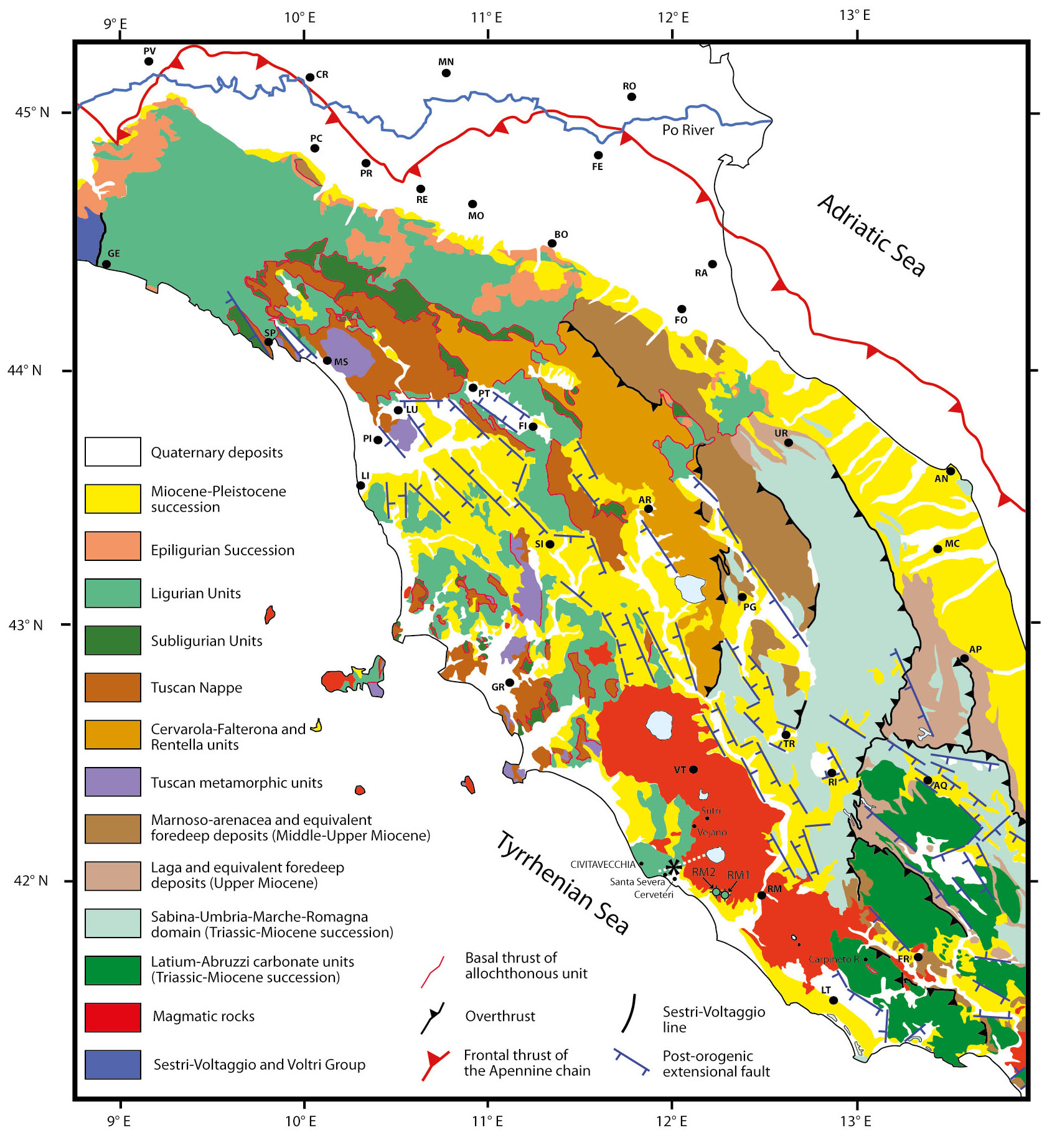 - Structural model of the northern and central Apennines. The asterisk shows the position of the “il Casone-Monte delle Fate” area, at the southern margin of the Monti della Tolfa. The white dashed line shows the trace of the geological cross section in Fig. 3. RM1 and RM2 are the locations of Roma 1 and Roma 2 deep boreholes, which drilled the allochthonous Ligurian Unit (Tolfa Unit). Data from Conti et al. (2020), northern Apennines, and Cosentino et al. (2002, 2010), central Apennines. AN-Ancona; AP-Ascoli Piceno; AQ-L’Aquila; AR-Arezzo; BO-Bologna; CR-Cremona; FE-Ferrara; FI-Firenze; FO-Forlì; FR-Frosinone; GE-Genova; GR-Grosseto; LI-Livorno; LT-Latina; LU-Lucca; MC-Macerata; MN-Mantova; MO-Modena; MS-Massa; PC-Piacenza; PG-Perugia; PR-Parma; PT-Pistoia; PV-Pavia; RA-Ravenna; RE-Reggio Emilia; RI-Rieti; RM-Roma; RO-Rovigo; SI-Siena; SP-La Spezia; TR-Terni; UR- Urbino; VT-Viterbo.