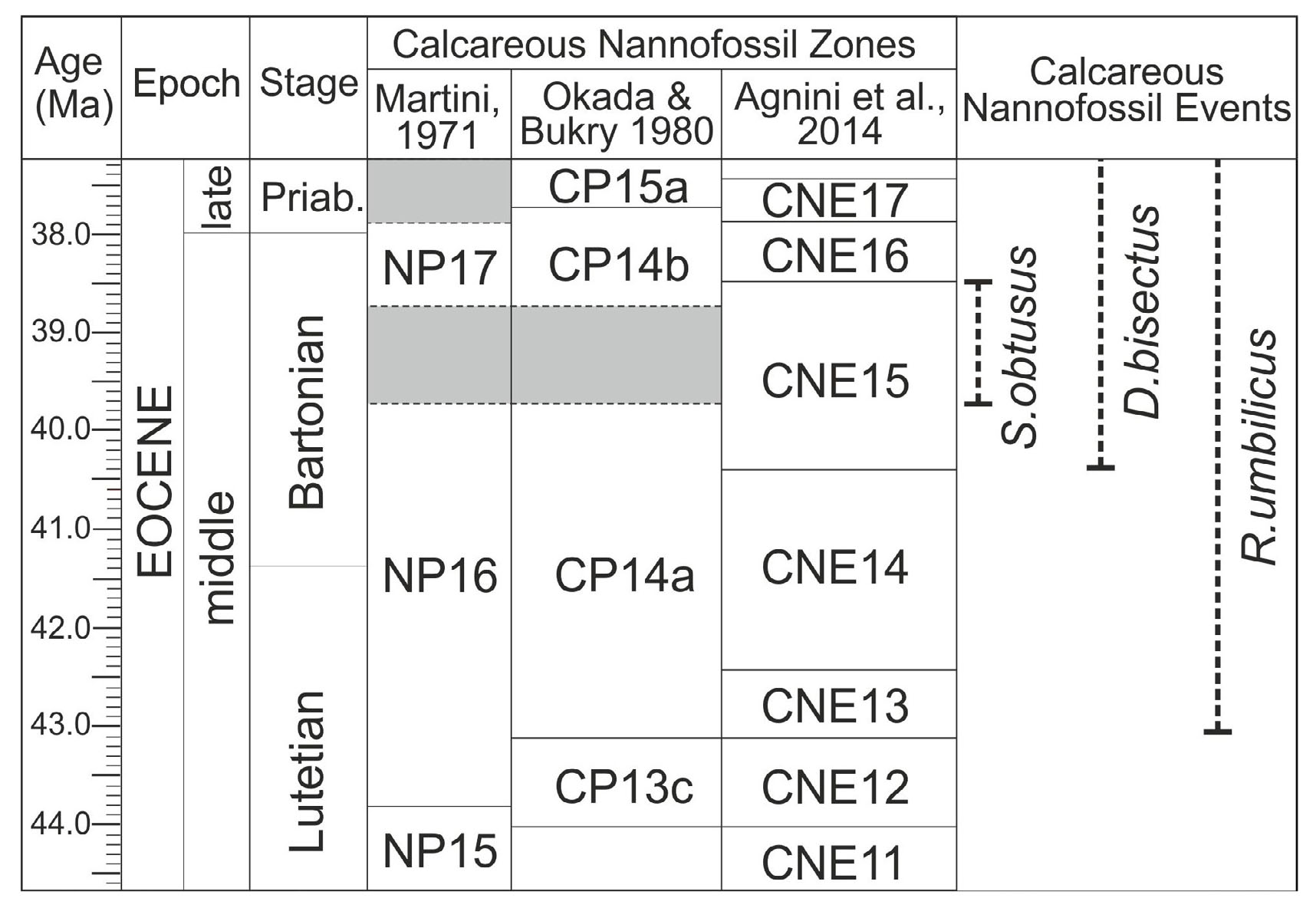 - Middle to late Eocene calcareous nannofossil biozonations, according to Martini (1971), Okada & Bukry (1980), and Agnini et al. (2014). The distribution of the marker species from “il Casone-Monte delle Fate” olistostrome is also shown.