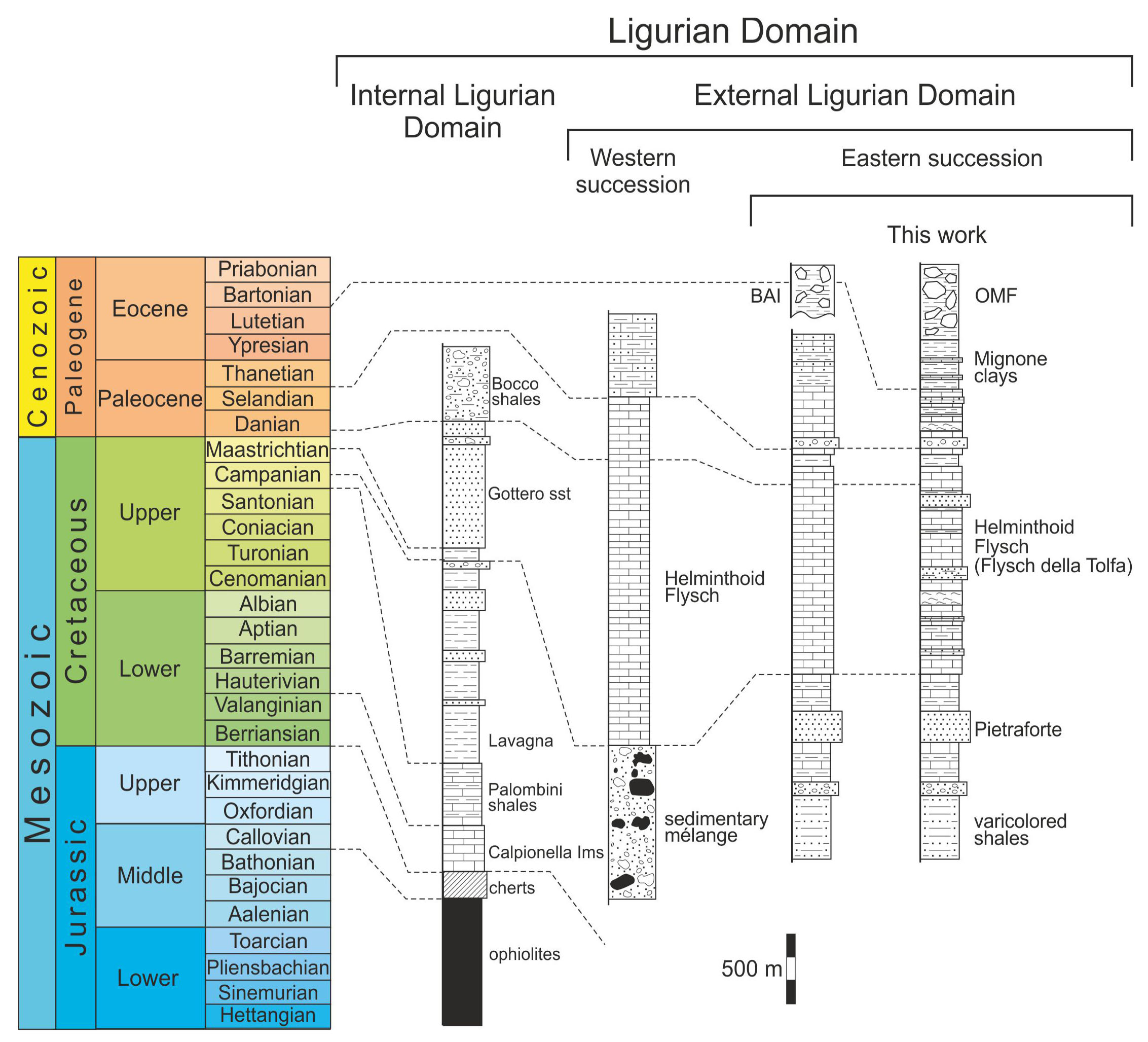 - Stratigraphy of the Ligurian Domain, after Marroni et alii (2001, 2017), Conti et al. (2020), and Festa (2020), modified according to the results from this work and including the basal portion of the Epiligurian succession of the Ligurian-Emilian Apennines. BAI – brecce argillose diBaiso (Epiligurian succession of the Ligurian-Emilian Apennines); OMF – il Casone-Monte delle Fate olistostrome.