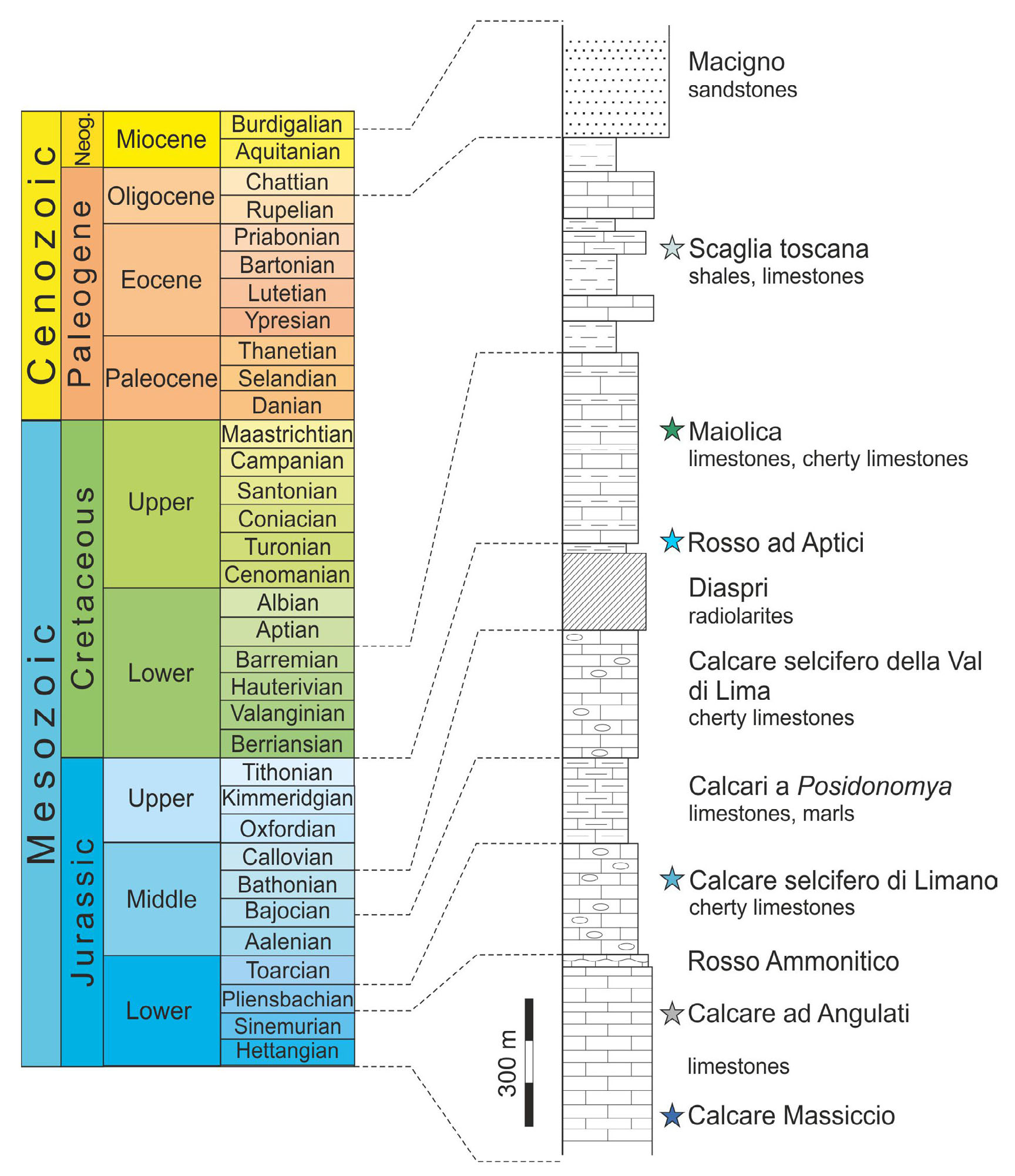- Stratigraphic log of the Tuscan Succession (modified after Conti et al., 2020). The coloured stars indicate the formations of the Tuscan Succession found as olistoliths within “il Casone-Monte delle Fate” olistostrome.