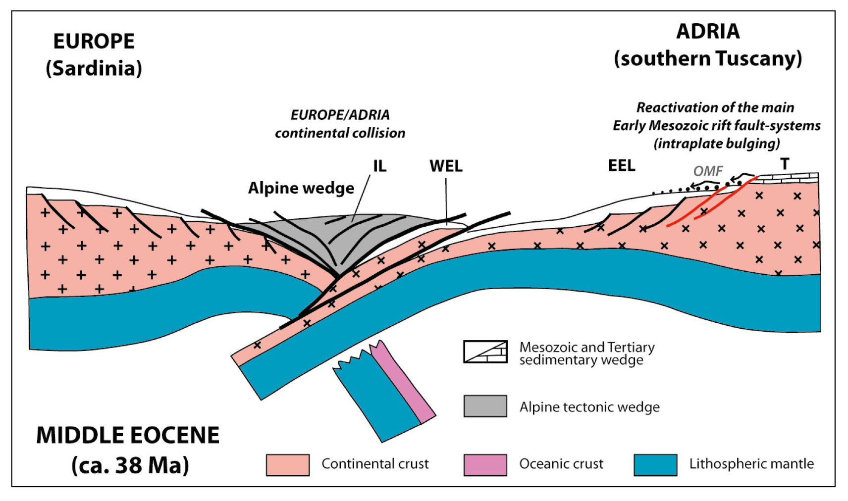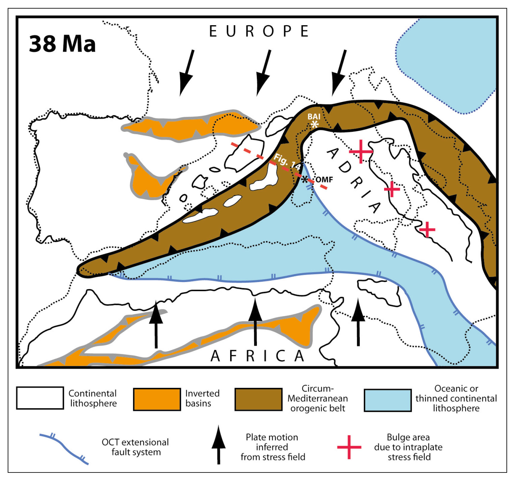 – Geodynamic reconstruction of the centralwestern Mediterranean area at 38 Ma, during the European-Adria continental collision (modified from Carminati et al., 2012). The inferred bulge of the Adria microplate due to intraplate stress field is also shown. The white asterisk shows the position of the “brecce argillose di Baiso” (BAI) Epiligurian Unit; the black asterisk shows the position of the “il Casone-Monte delle Fate” Olistostrome (OMF) in the Eastern External Ligurian Domain of northern Latium, not yet involved in the orogenic deformation; the red dashed line indicates the trace of the geodynamic section of Fig. 14.