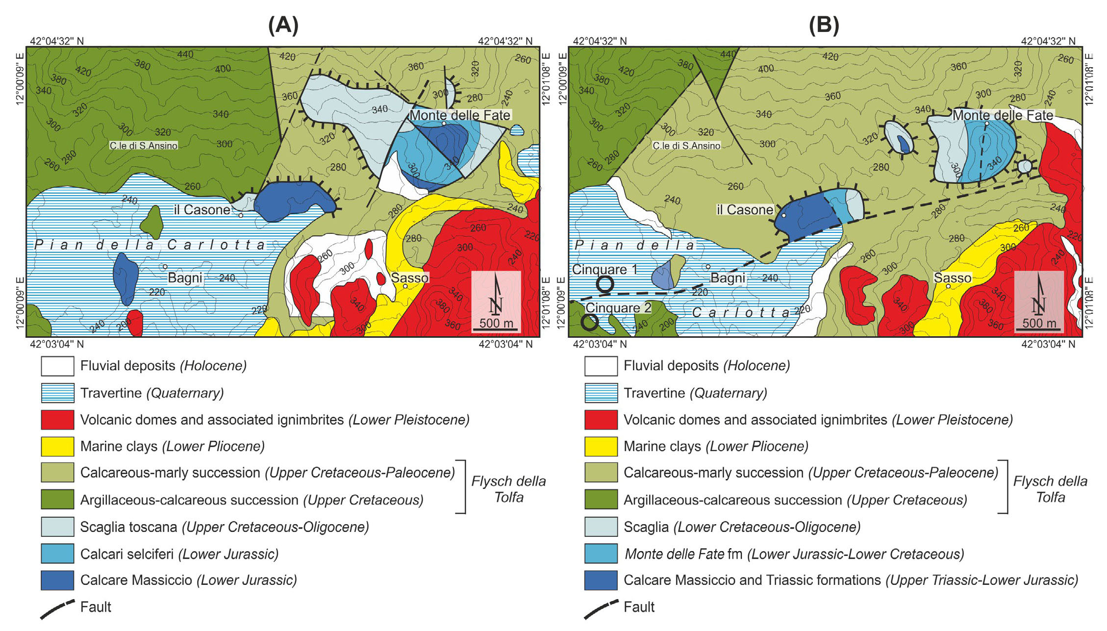 In Pian della Carlotta, two boreholes (Cinquare 1, 126.56 m t.d.; Cinquare 2, 251.30 m t.d.) were drilled in the 1950’s by “Montecatini - Società generale per l’industria mineraria e chimica” for water research (see location in Fig. 2B). Beside the gravity profile by Di Filippo & Toro (1993), the stratigraphy of these boreholes (Vighi, 1955) are the only data on the subsurface geology of the study area.