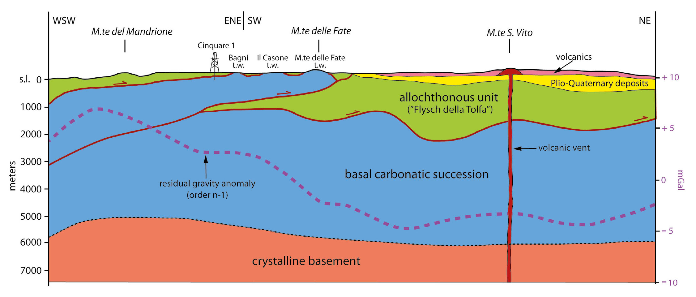 - Gravimetric profile crossing “il Casone-Monte delle Fate” area with the “Bagni”, “il Casone”, and “Monte delle Fate” tectonic windows. The position of the Cinquare 1 borehole is also shown. The trace of the gravimetric profile is shown in Fig. 1. Redrawn and modified after Di Filippo & Toro (1993).