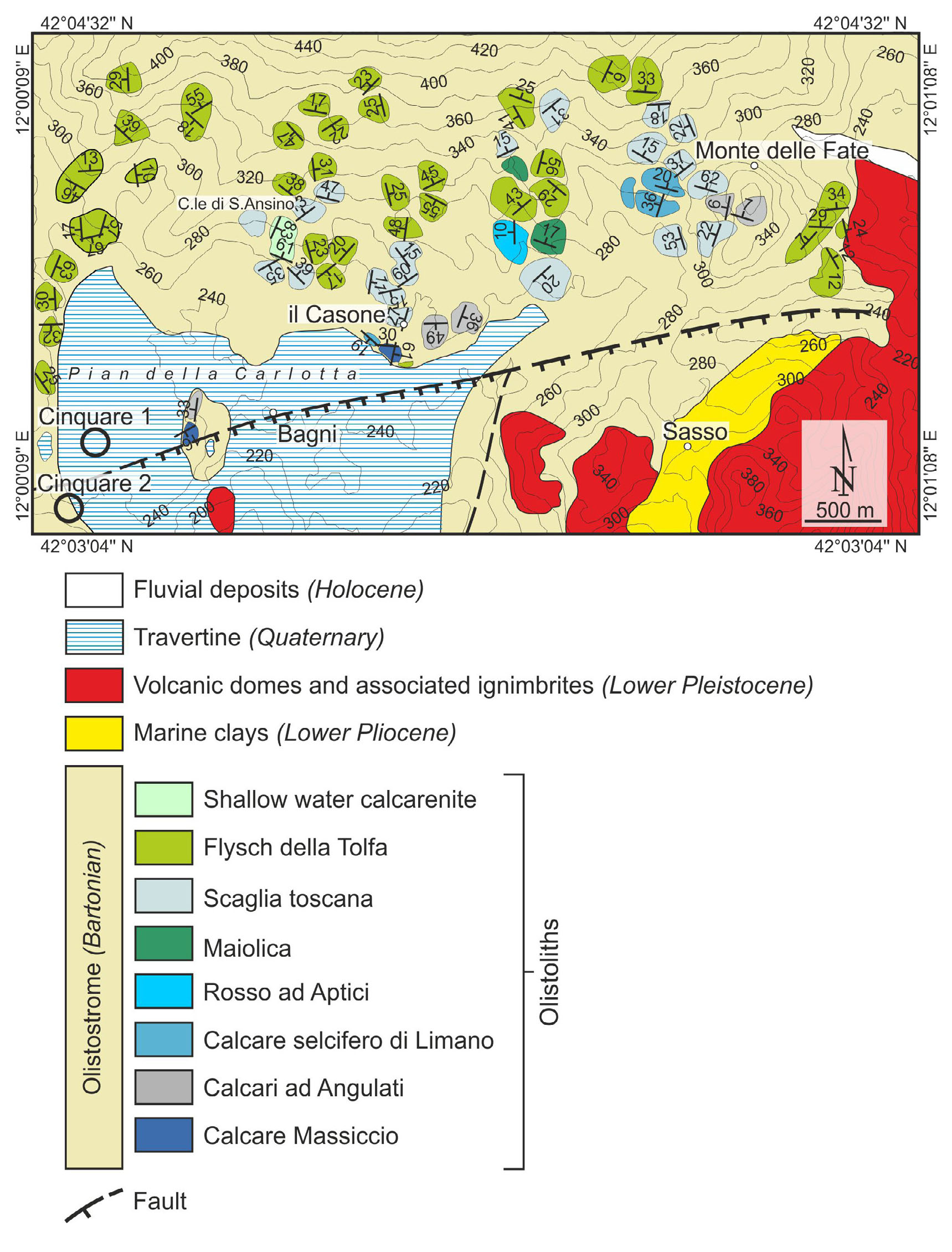 The stratally disrupted chaotic complex cropping out in “Bagni”, “il Casone”, and “Monte delle Fate” areas, which contains both native (i.e., intraformational) and exotic (i.e., extraformational) blocks, might have resulted from various mass transport events (e.g., Festa et al., 2016, with references therein). As evidenced by the lithologies of the different olistoliths embedded within the highly tectonized argillaceous matrix of “il Casone-Monte delle Fate” olistostrome, the provenance area of the olistoliths is both from a pelagic domain with Tuscan affinity and the Eastern External Ligurian Domain (Flysch della Tolfa olistoliths). Almost all the formations of the stratigraphic succession of the Tuscan Domain, starting from the Calcare Massiccio (Lower Jurassic) up to the Scaglia toscana (Upper Cretaceous-Eocene) are represented as olistoliths in “il Casone-Monte delle Fate” olistostrome (Fig. 12).