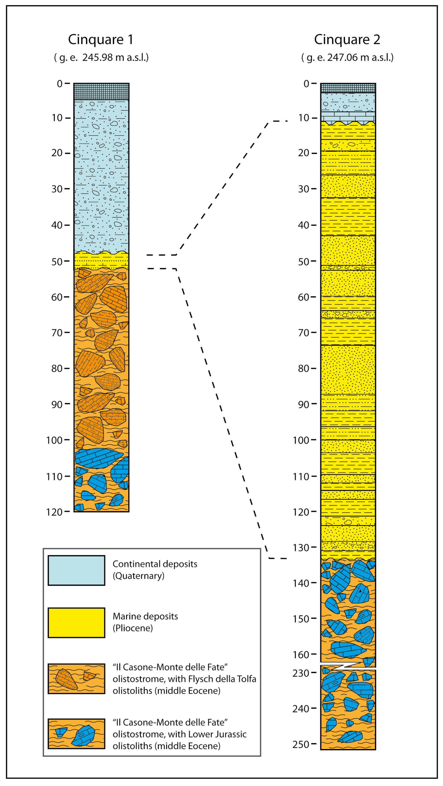 This olistostrome also crops out in the “Bagni” area, where to the west of “Bagni” a small portion of the olistostrome, characterized by olistoliths of Calcare Massiccio and Calcari ad Angulati wrapped in an argillaceous matrix, crops out below the Quaternary cover of the travertine plateau. In the same area, beneath some Plio-Quaternary covers, “il Casone-Monte delle Fate” olistostrome was drilled by the Cinquare 1 and Cinquare 2 boreholes (Fig. 5). Starting from 104 m depth, the Cinquare 1 borehole drilled 16 m of dark-grey and grey brecciated limestones, referred by Vighi (1955) to the Lower Jurassic limestones cropping out in the “Bagni” area, and interpreted in this work as olistoliths of Calcare Massiccio and Calcari ad Angulati within “il Casone-Monte delle Fate” olistostrome. The Cinquare 2 borehole, starting from 133 m depth, drilled 118 m of grey-beige, grey, and dark-grey limestones, sometimes brecciated, similar to the limestones drilled in the basal part of Cinquare 1 borehole. It is worth noting that the recovery ratios of these limestones were really low for a carbonate succession. In the Cinquare 1, the dark-grey limestones were recovered with 61% of recovery ratio, whereas in the Cinquare 2 the recovery ratio was only 30% (Vighi, 1955). Thus, according to our field results (Fig.4) and the recovery ratio of the Mesozoic limestones in Cinquare 1 and Cinquare 2 wells (see Fig. 5), both these boreholes drilled “il Casone-Monte delle Fate” olistostrome, which in the “Bagni” area shows a minimum thickness of ca. 120 m.