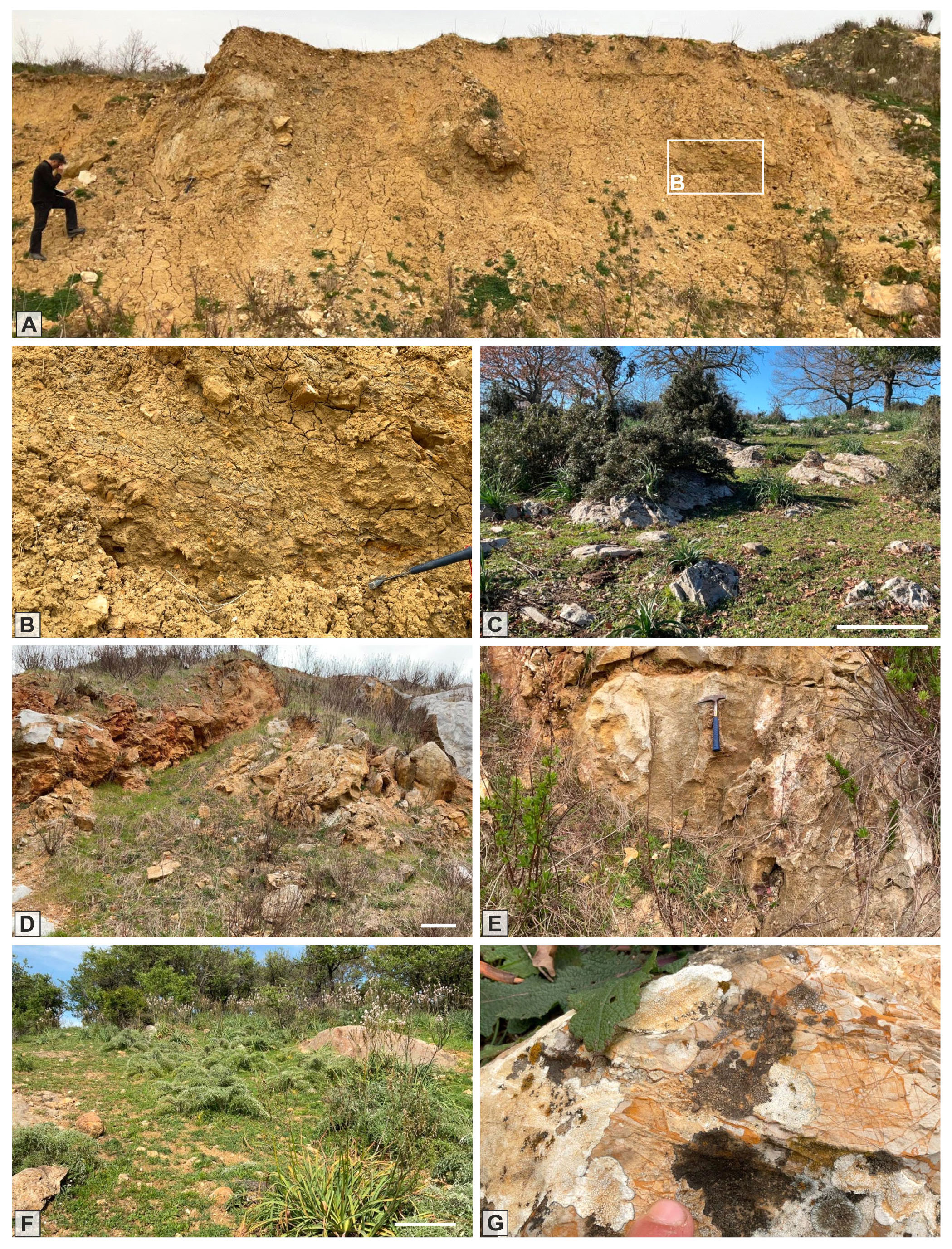 - Field photographs showing some details of “il Casone-Monte delle Fate” olistostrome. A) Outcrop of “il Casone-Monte delle Fate” olistostrome at “il Casone” (42°03’48″N, 12°01’48″E), showing different olistoliths embedded within a tectonized argillaceous matrix; B) Close up of the previous photograph showing a detail of the argillaceous matrix of the olistostrome embedding some small carbonate olistoliths; C) stratally disrupted beds of Scaglia toscana (42°03’45″N, 12°01’37″E); D) disrupted massive beds of Calcari ad Angulati (42°03’42″N, 12°01’46″E); E) detail of an olistolith of Calcari ad Angulati (42°03’46″N, 12°01’52″E); F) stratally disrupted beds of Flysch della Tolfa (42°02’33″N, 12°00’09″E); G) detail of a “pietra paesina” olistolith (Flysch della Tolfa) (42°03’50″N, 12°01’07″E). White scale bar is 0.5 m.
