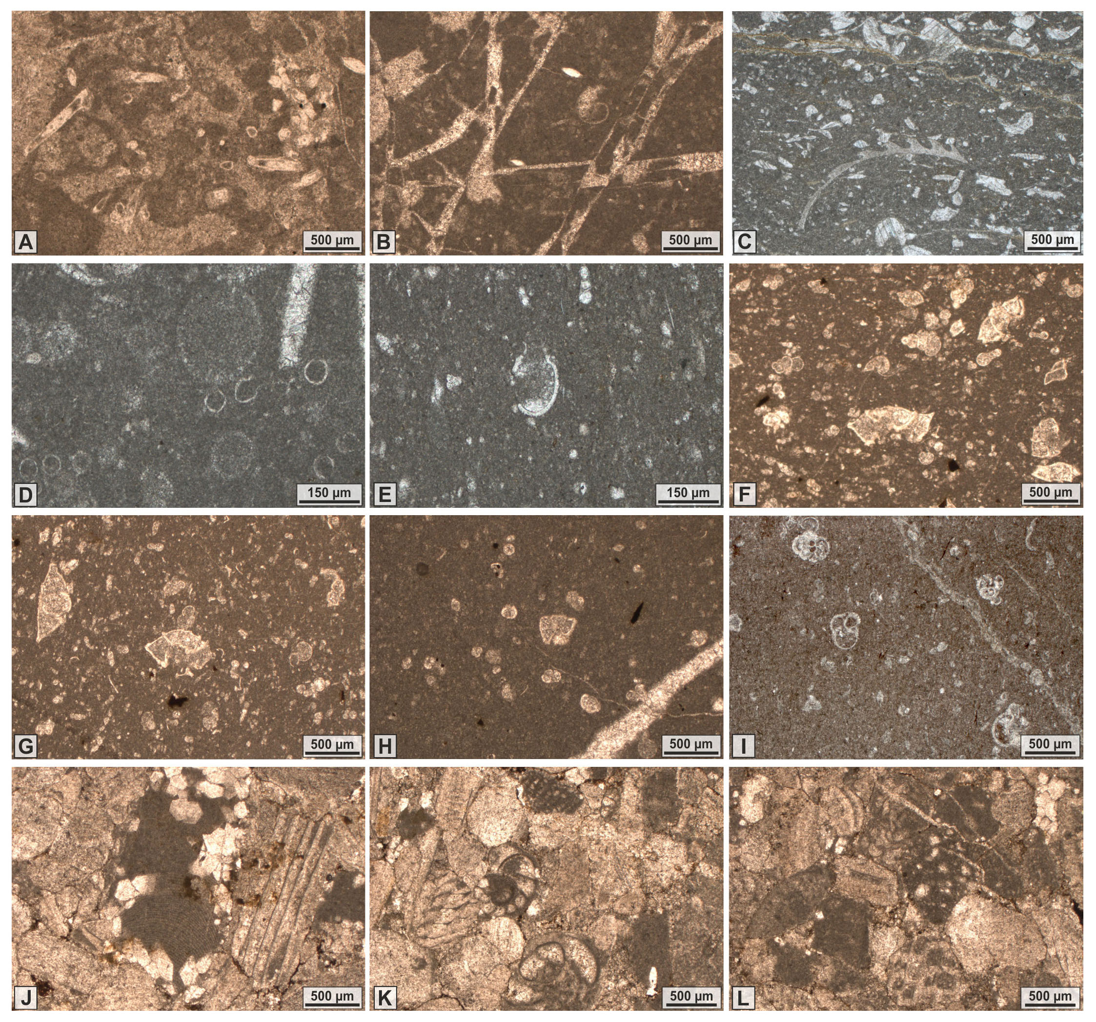 - Thin section microphotographs of the most representative olistoliths of “il Casone-Monte delle Fate” olistostrome. A) packstone with large spicules of sponge (Calcari ad Angulati); B) packstone/wackestone with gastropod and sponge spicules (Calcari ad Angulati); C) wackestone with Aptychus and calcite plates (Rosso ad Aptici); D) wackestone with radiolarians and calpionellids (Calpionella alpina) (Maiolica); E) wackestone with radiolarians and Calpionella elliptica (Maiolica); F) wackestone with planktonic foraminifers (Globotruncana stuarti, Heterohelix sp.) and radiolarians (Scaglia toscana); G) wackestone with planktonic foraminifers (Globotruncana conica) and radiolarians (Scaglia toscana); H) wackestone with planktonic foraminifers (Acarinina topilensis) and radiolarians (Scaglia toscana); I) wackestone with planktonic foraminifers (globigerinids) and radiolarians (Scaglia toscana); J) packstone with bryozoans and red algae (Shallow-water calcarenite); K) packstone with bryozoans, benthic foraminifers (rotalidae), and red algae (shallow-water calcarenite); L) packstone with benthic foraminifers (orbitoids) and fragments of echinoids (shallow-water calcarenite).