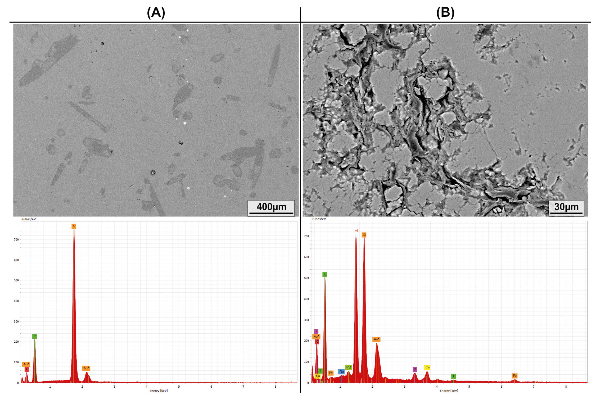 - Scanning electron micrographs, and relative EDS microprobe analysis, of thin sections from Calcari ad Angulati samples. A) (above) the SEM micrograph shows several spicules of sponge; (below) EDS microprobe spectrum showing the silica composition of the spicules of sponge; B) (above) SEM micrograph of the argillaceous crust coating a Calcari ad Angulati olistoliths; (below) EDS microprobe spectrum showing the phyllosilicate composition of the crust coating the olistolith.