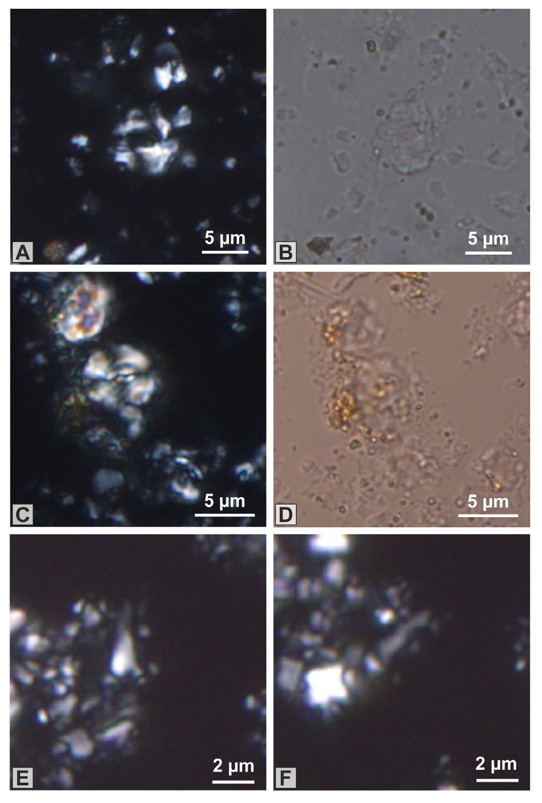 - Microphotographs of some calcareous nannofossils marker species from the argillaceous matrix of “il Casone-Monte delle Fate” olistostrome. A) Reticulofenestra umbilicus group (crossed nicols) (sample SS 33); B) Reticulofenestra umbilicus group (parallel light) (sample SS 33); C) Dictyococcites bisectus (crossed nicols) (sample SS 7); D) Dictyococcites bisectus (parallel light) (sample SS 7); E) Sphenolithus obtusus (crossed nicols, 0°) (sample SS 14); F) Sphenolithus obtusus (crossed nicols, 45°) (sample SS 14).