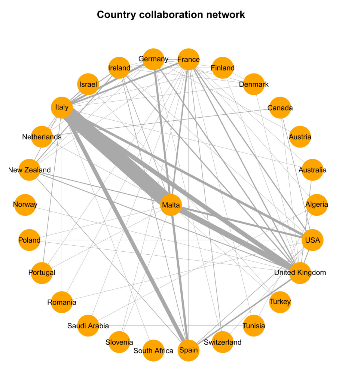 The plot highlights that the authors from Italy and the United Kingdom are those with whom Maltese geoscientists have most frequently collaborated (55 and 20 collaborations respectively). The plot distinctly illustrates the central role of scientific collaboration between Italy and Malta in this specific research domain. Spain (8 collaborations), USA (7 collaborations), and Germany (7 collaborations) show a high degree of connection with the Maltese geoscience community.