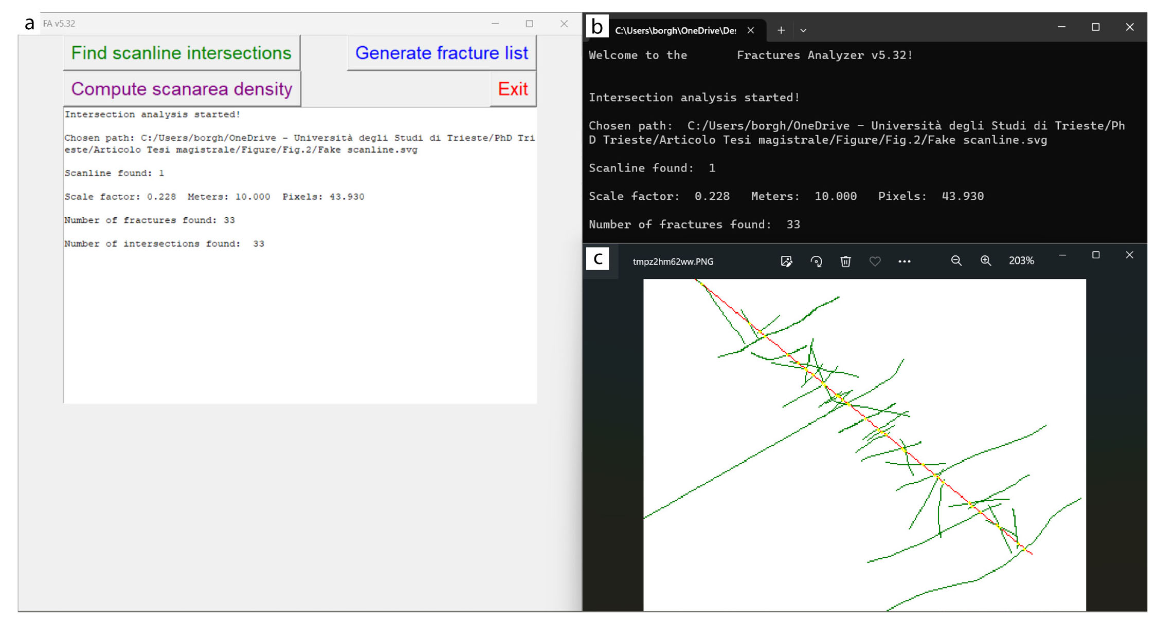 - Fracture Analyser user interface, function selection buttons, and short report (a), a brief report of the analysis performed (b), and the output image of the analysis performed (c).