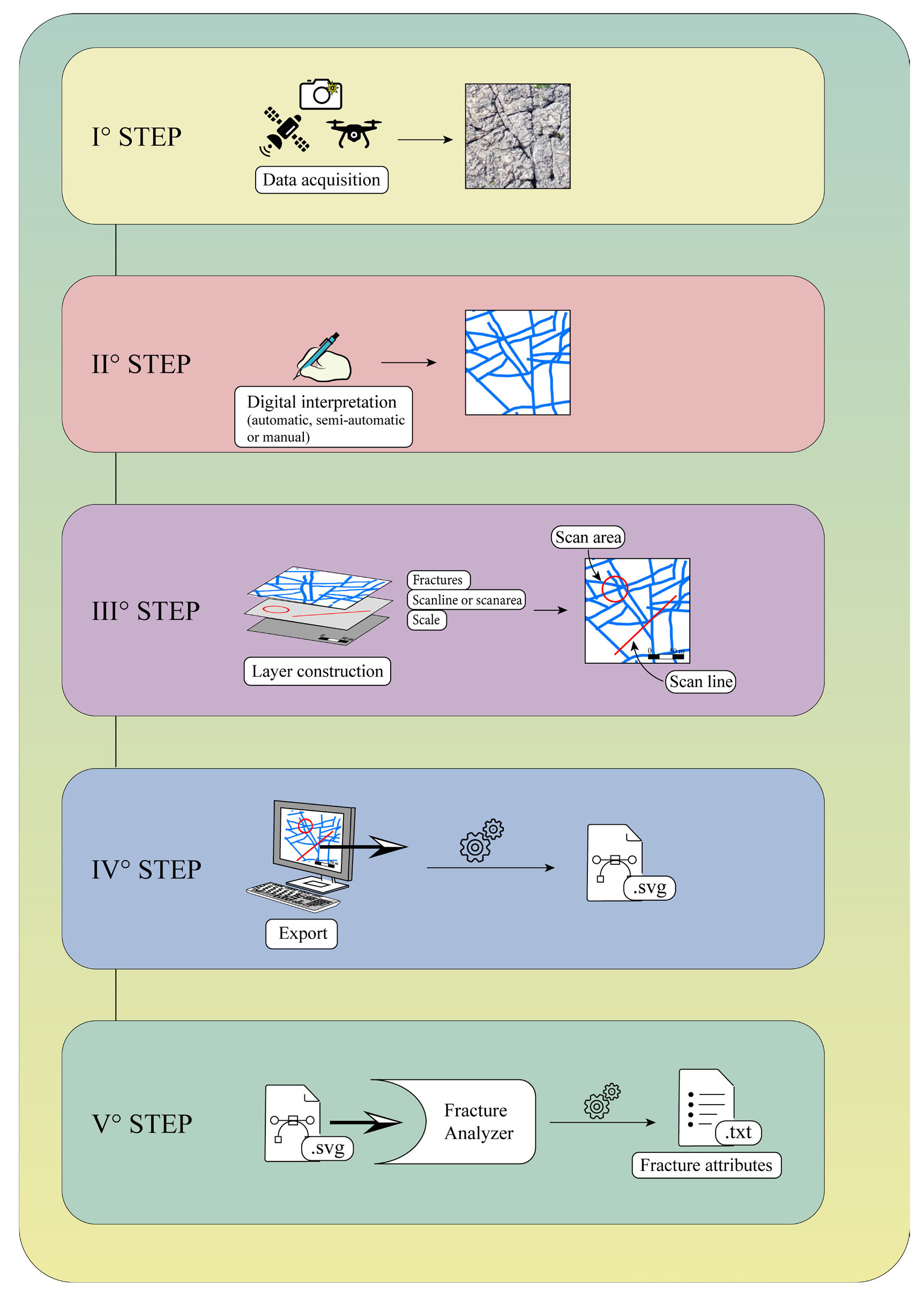 The input data consists of a scalable vector graphic file (SVG) containing digital fracture traces and polygons to analyse the region of interest. The software outputs attributes of individual fractures, characteristics for the entire pattern, and attributes for a single fracture set. With all these attributes, it is possible to perform a statistical analysis of fracture patterns (Roberts et al., 2019). The software is currently limited to 2D fracture pattern analysis.
