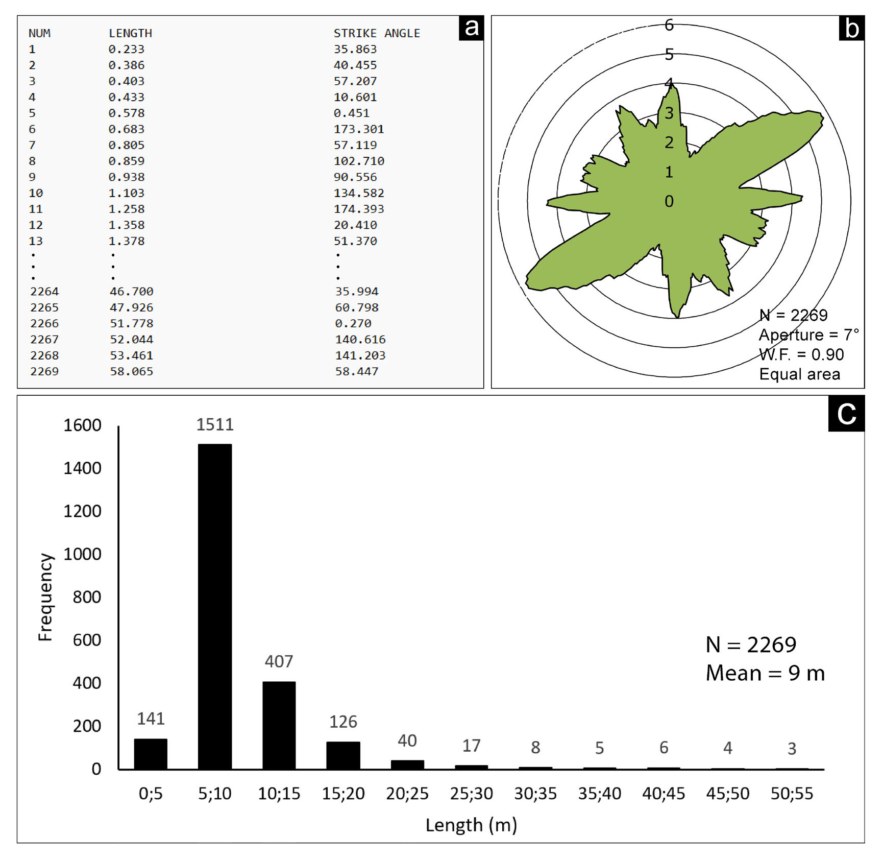 - Attributes of the fractures obtained with FA and its “fracture list” function (a). MARD (Munro & Blenkisop, 2012), n = 2269, aperture = 7°, weighting factor = 0.90 (b). Histogram of the distribution of fracture lengths every 5 m (c).