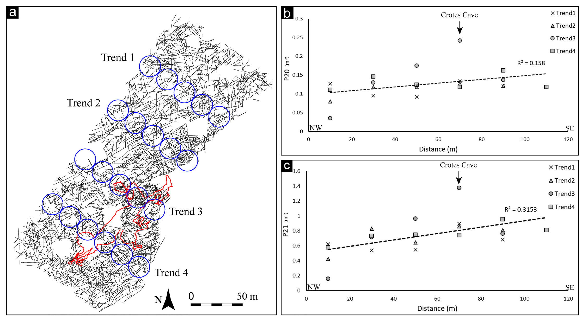 Scan area analysis with FA “compute scanarea density” function allowed us to automatically derive the values of P20 (fracture density) and P21 (fracture intensity) of the Rosario dataset and highlight the fracture trend distribution along the outcrop. A total of 21 scan areas with a diameter of 20 m were realised, organised along 4 NW-SE oriented trend directions (Fig. 8a), coinciding with the previous linear scanline analyses (Fig. 7a). The values of P20 resulting from the analyses vary between 0.04 m-2 and 0.24 m-2. In contrast, those of P21 vary between 0.18 m-1 and 1.37 m-1. The interpolated data with linear regression and coefficient of determination R2=0.158 for P20 and R2=0.315 for P21 show a gradual increase of P20 and P21 towards the SE, i.e., approaching the Apodi fold axis and displaying a clear peak above Crotes Cave (Fig. 8b). The maximum values of P20 and P21 were recorded along the trend 3 (Fig. 8b, and c) above the Crotes Cave and allowed rainwater to percolate and originate the Crotes cave (Bagni et al., 2020).