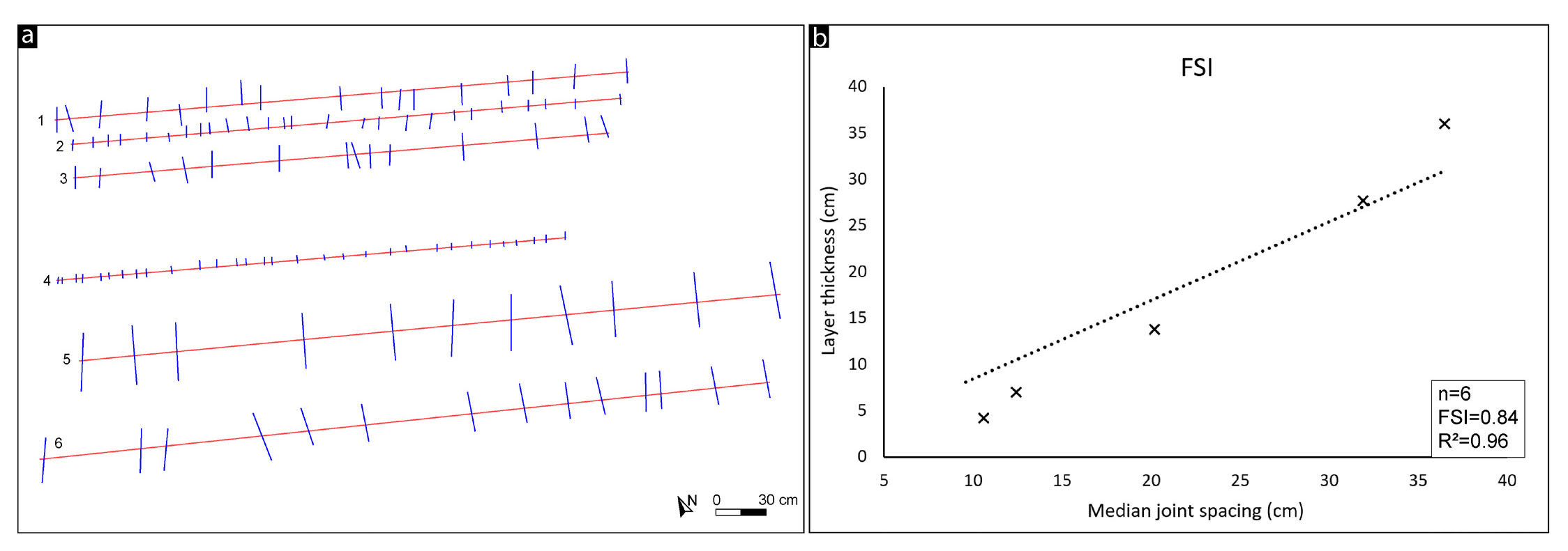 FA can use its ‘scanline’ function to investigate a sub-vertical outcrop and derive Fracture Spacing Ratio (FSR) and Fracture Spacing Index (FSI) values. Hence, six linear scanlines were performed in the sandstones of the Flysch of Trieste, intersecting a total of 113 fractures (Fig. 9a). Each scanline investigates an arenaceous layer of different thicknesses ranging between 7 cm and 36 cm. The median spacing between the joints varies from a minimum of 10.5 cm in scanline 4 to a maximum of 36.5 cm in scanline 5. Fig. 9b shows the FSR/FSI plot, where each cross represents the FSR value for each scanline, and the linear regression approximates the data well, with a coefficient of determination R2=0.96. The slope of the linear regression interpolating the various FSRs indicates an FSI=0.84.