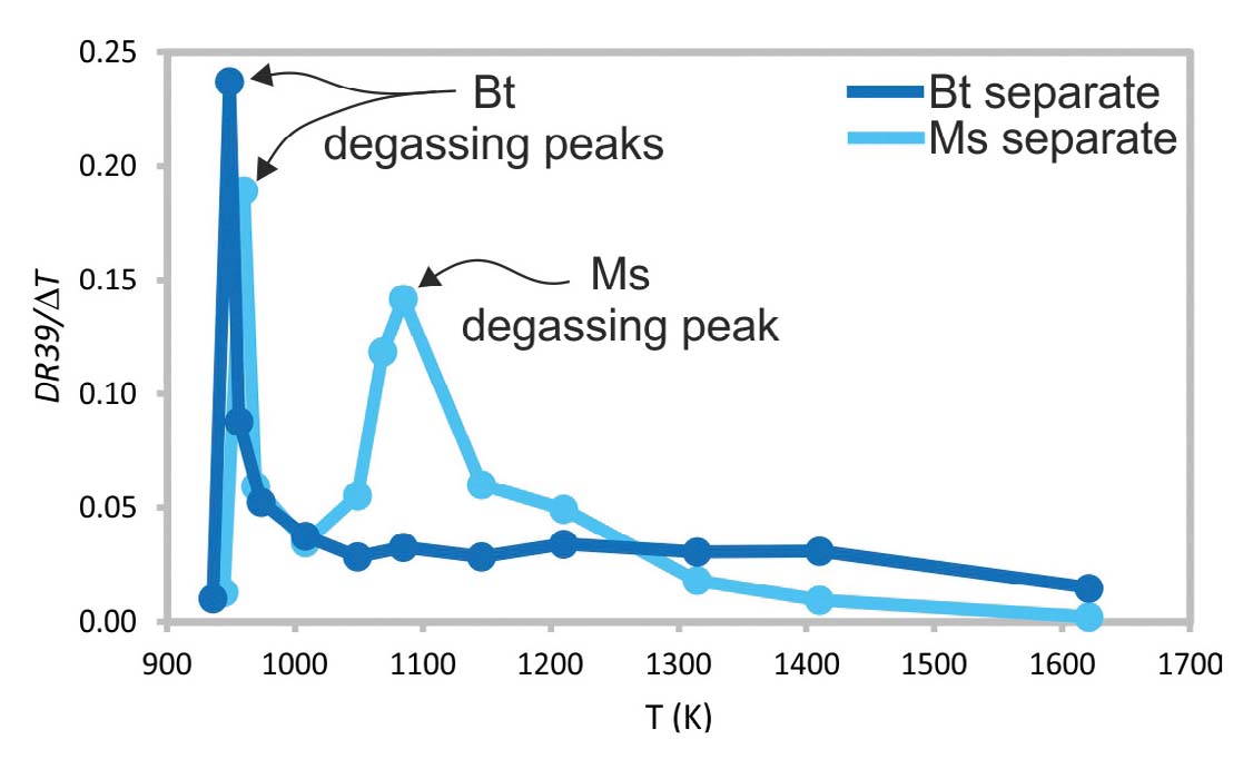 - Differential Release plot for a mylonitic calcschist from the Munsiari Thrust (analyzed by Montemagni et al., 2020), containing easily separated, “pure” biotite as well as muscovite intimately intergrown with biotite, as testified by both the Bt and Ms peaks in the muscovite separate. The differential 39Ar release normalised to the step temperature interval for biotite shows a sharp peak at 950 K, followed by a low DR39/ΔT throughout all subsequent steps. The 39Ar release of muscovite, on the other hand, has two differential release peaks, one coincident with that of biotite, one around 150 K higher. The interpretation based on petrographic observations is that muscovite contains finely intergrown biotite layers. Data from Montemagni (2020).
