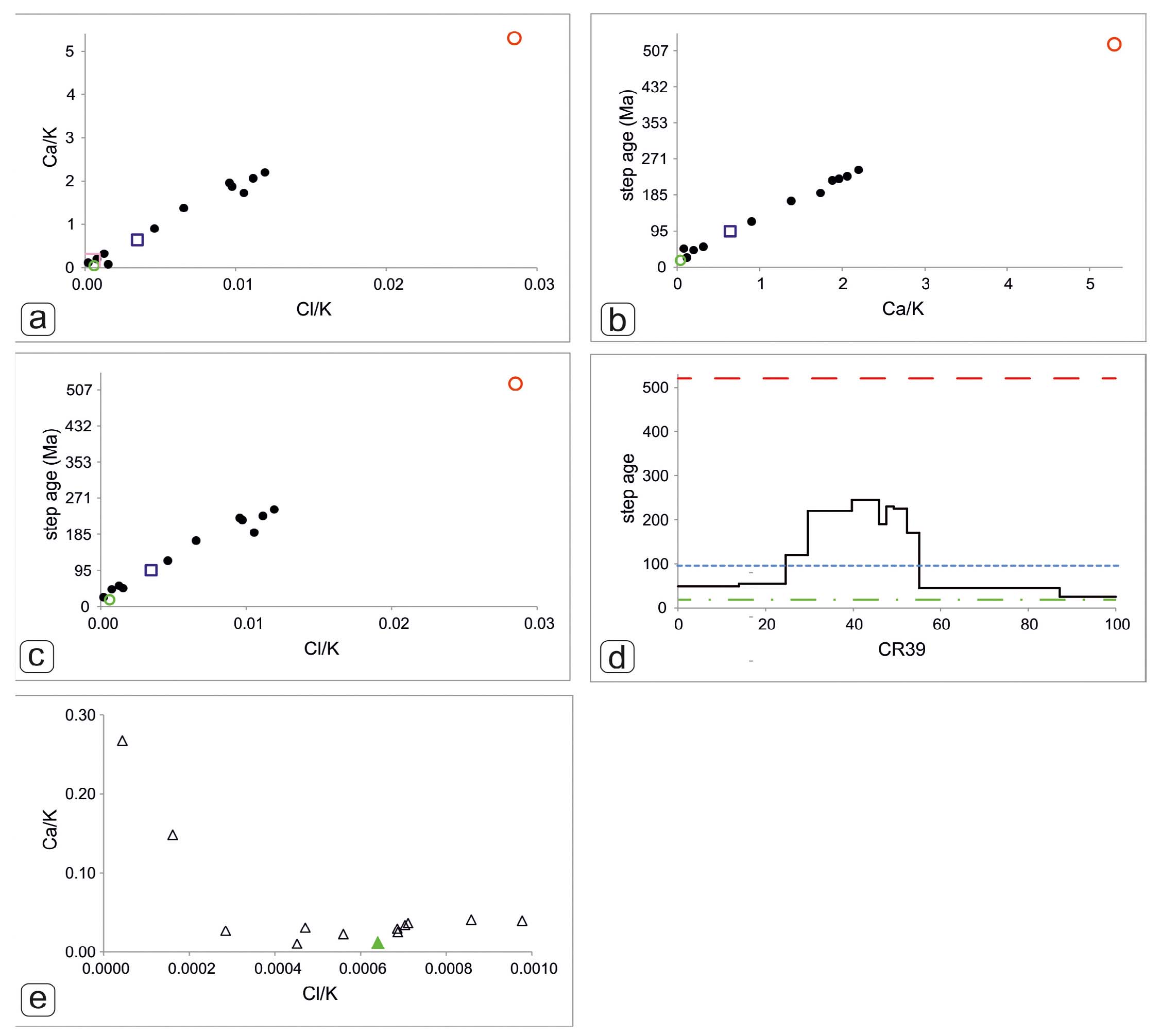 ii. The second indication is provided by comparing the differential Ar release in different steps with the Ca/K and Cl/K ratios in the same steps: the steps most likely to yield a reliable step age are those released by the predominant mineral in the analyzed separate and at the same time those that have uniform Ca/K and Cl/K ratios closest to stoichiometry. In contrast, devious ratios indicate degassing of alteration and/or retrogression mineral phases (e.g., Simon-Labric et al., 2009).