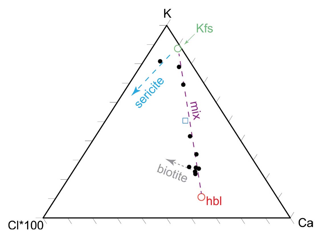 - Triangle plot of the compositional constraints on mineral petrogenesis. The diagram has K, Ca and Cl at its vertices (the latter multiplied by 100, due to its low abundance in most minerals). Symbols as in Fig. 2a-c. The two vectors pointing towards the left identify two contaminant phases: biotite intergrowths in the hornblende, and sericite alteration of the microcline. This diagram is complementary to Fig. 2, as it helps fingerprint intergrown impurity phases.