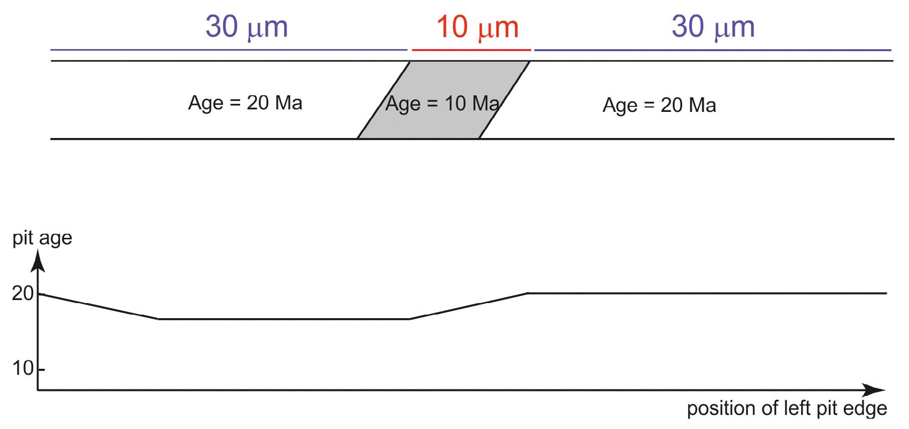 - Schematic view of the effect of analyzing a microstructure smaller than the spatial resolution of the laser microprobe. The mineral in the upper part of the panel consists of a large 20 Ma old crystal (white) with a 10 Ma old, 10 µm wide intergrowth (grey). In this example the laser microprobe has a 30 µm spatial resolution. As long as the laser pits only ablate the white zone, a constant age of 20 Ma is obtained. By obtaining closely (< 1 µm) spaced laser pits across the intergrowth, progressively younger ages are obtained, whereby the minimum age remains constant at 16.66 Ma as long as the entire width of the intergrowth is within the laser pit. By moving the laser further towards the right, ages increase again up to the constant value of 20 Ma. It may appear that the 16.66 Ma minimum age does not provide a good estimate of the 10 Ma intergrowth age. However, by measuring the widths of the laser pit and of the intergrowth on an electron microprobe element map obtained on the exact location of the laser traverse it is possible to calculate the mass balance of the host mineral and the intergrowth. In this case, the mass ratio intergrowth:host ranges between 0 and 1:2, which by cross-multiplication translates to an intergrowth age of 10 Ma.