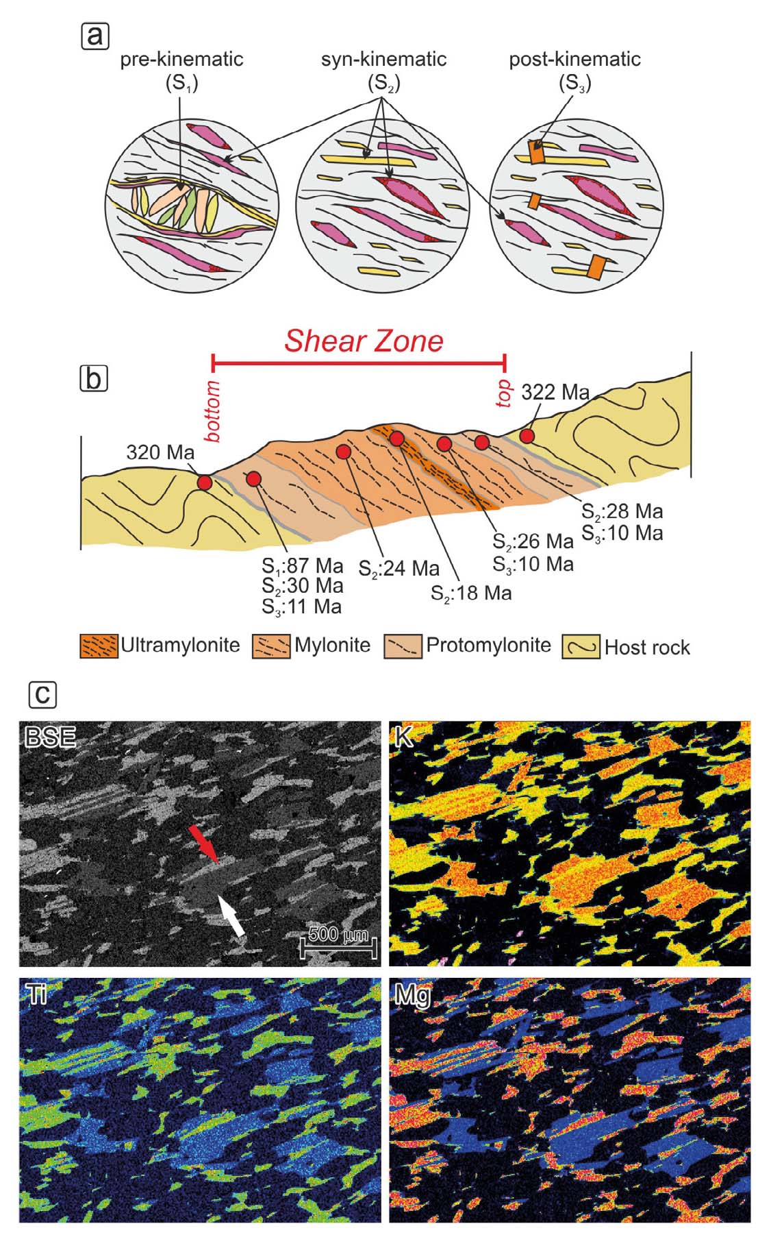 Reconstructing a detailed shear zone deformation history therefore requires integrating petrochronologic data of pre, syn, and post-kinematic minerals in sheared rocks (Fig. 5a) with additional geochronologic constraints on protolith ages and wall rocks (Fig. 5b). Larger-scale interpretations are robust when supported by the analysis of µm-scale textures and when the information provided by microtextures (Fig. 5a,b) is correctly understood.