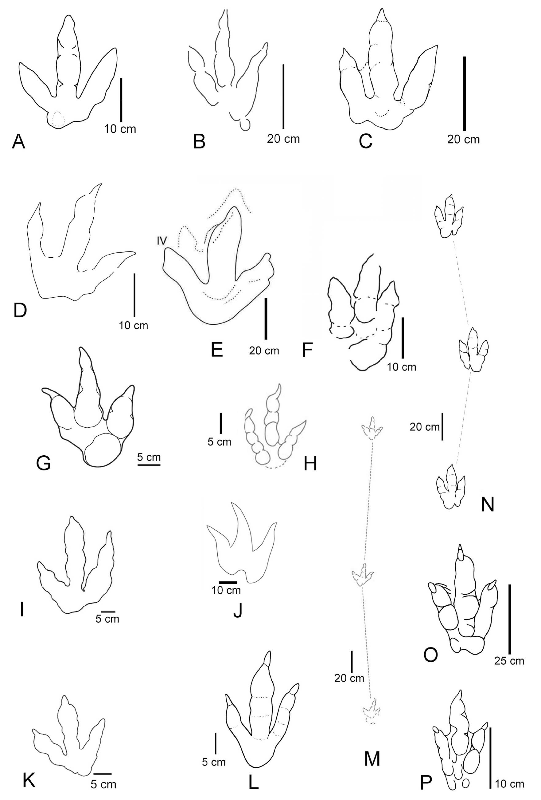 - Large theropod footprints from the Triassic as sketches. A, Pengxianpus cifengensis from Xujiahe Fm. (Late Triassic) of Sichuan Province, China. B-O. Anchisauripus-Eubrontes. B, From Lower Elliot Fm. (Norian) of Lesotho, Southern Africa. C, From Höganäs Fm. (Late Triassic, Rhaetian) of southern Sweden. D, From Lower Elliot Fm. (Norian) of Lesotho, Southern Africa. E-F, From Timezgadiouine Fm. (T5, Carnian) of the Argana Basin, Morocco. G, From Late Triassic (Carnian) of the Southern Alps. H, From Late Triassic (Norian) of southern France. I, From Tomanová Fm. (?Late Norian-Rhaetian) of Slovakia. J, From Caturrita Fm. (Early Jurassic of Brazil. K, From Tomanová Fm. (?Late Norian Rhaetian) of Slovakia. L, From Early Jurassic (Hettangian) of northern Bavaria, Germany. M, From Late Triassic (Norian) of southern France. N-O, Eubrontes giganteus from Early Jurassic of Newark Supergroup, North America (O = type). P, Anchisauripus sillimani (type) from Early Jurassic of Newark Supergroup, North America. Sketches from Ellenberger et al. (1970), Haubold (1971b, 1984), Gierliński & Ahlberg (1994), Olsen et al. (1998), Gand et al. (2000), Lucas et al. (2006), Klein & Haubold (2007), Niedźwiedzki (2011), Lagnaoui et al. (2012), Silva et al. (2012), Bernardi et al. (2013) and Xing et al. (2013).