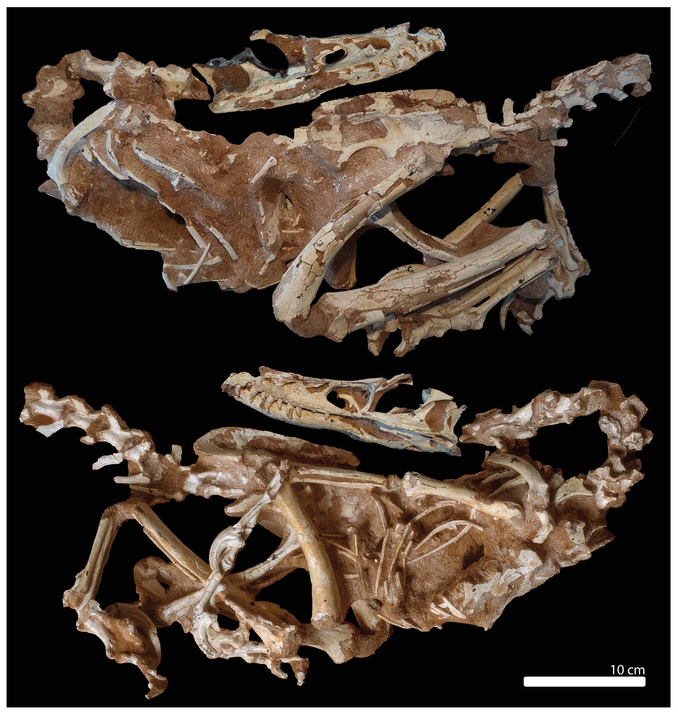 Over the past fifty years, palaeontological expeditions in Mongolia have yielded numerous Velociraptor specimens, including several nearly complete and fully articulated skeletons (Tab. 1). The most remarkable discovery is the famous “fighting dinosaurs” fossil, which captures a Velociraptor and a Protoceratops in a mortal combat. Discovered in 1971 by a Polish-Mongolian expedition at the Tugrik locality near the Flaming Cliffs, this fossil provides a rare and vivid snapshot of interspecies interaction (Kielan-Jaworowska & Barsbold, 1972). The two dinosaurs appear to have been buried alive in the midst of combat, possibly due to a sudden sandstorm or the collapse of a rain-soaked dune (Norell & Makovicky, 2004). The Velociraptor specimen is seen plunging its right sickle claw into the neck and the left into the belly of the Protoceratops, while the latter clamped the former’s right arm with its powerful beak. This interaction, once interpreted to having occurred at twilight, based on the finding that Velociraptor was nocturnal (Schmitz & Motani, 2011). However, re-evaluation of the correlation between scleral ring size and diel patterns are inconclusive for Velociraptor, making it impossible to ascertain the exact time of day of the encounter (Choiniere et al., 2021).