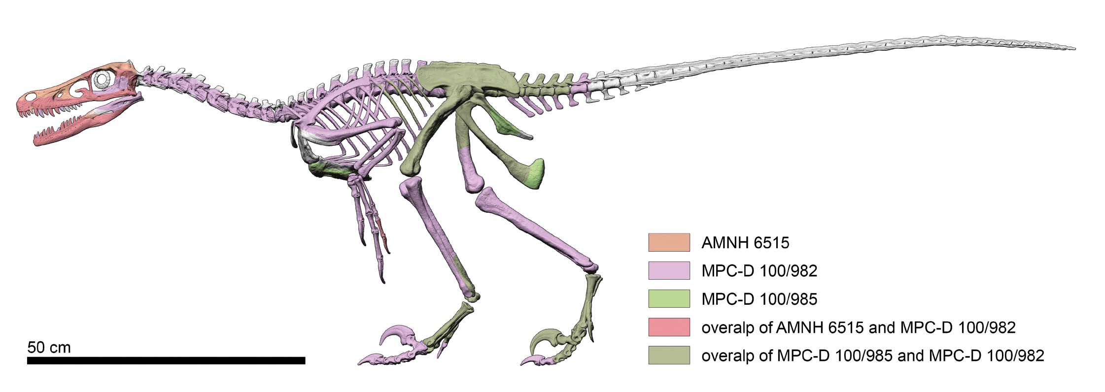 - Skeletal reconstruction of Velociraptor. Colour schematic representation of the available material belonging to AMNH 6515, MCP-D 100/982, and MCP-D 100/985. Size is based on MCP-D 100/25.