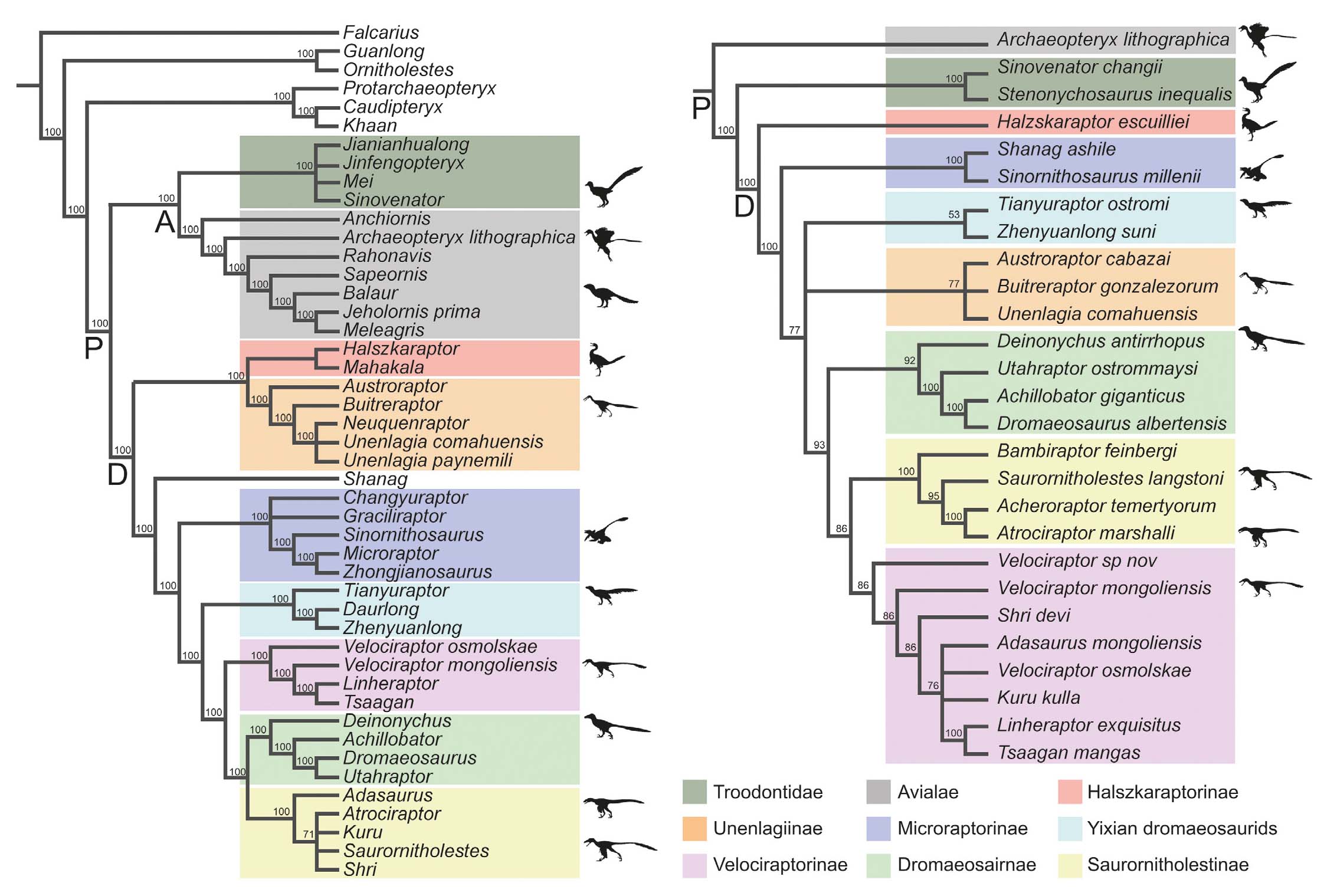 - Cladograms (50% majority rule consensus trees) obtained with Wang et al. (2022) (a) and Czepiński (2023) (b) data matrix. The two results represent different outputs of different research groups and are here presented to comment on the differences in the topology obtained. See text for details on method and discussion. Abbreviations: P=Paraves; A=Averaptora; D=Dromaeosauridae. 0-100 numbers indicate frequency of occurrence for each node. Silhouettes used in the Figure are available at phylopic.org. Shared under public domain: Archaeopteryx lithographica by T. Michael Keesey; Sinovenator changii by Tasman Dixon. Shared under CC BY-SA 3.0 (creativecommons.org/licenses/by-sa/3.0/): Atrociraptor marshalli, Balaur bondoc, Deinonychus antirrhopus, and Sinornithosaurus millenii by Emily Willoughby; Mahakala omnogovae by Scott Reid; Tianyuraptor ostromi by Mette Aumala; Saurornitholestes langstoni and Velociraptor mongoliensis by Scott Hartman. Shared under CC BY 4.0 (creativecommons.org/licenses/by/4.0/): Buitreraptor gonzalezorum by Ivan Iofrida.