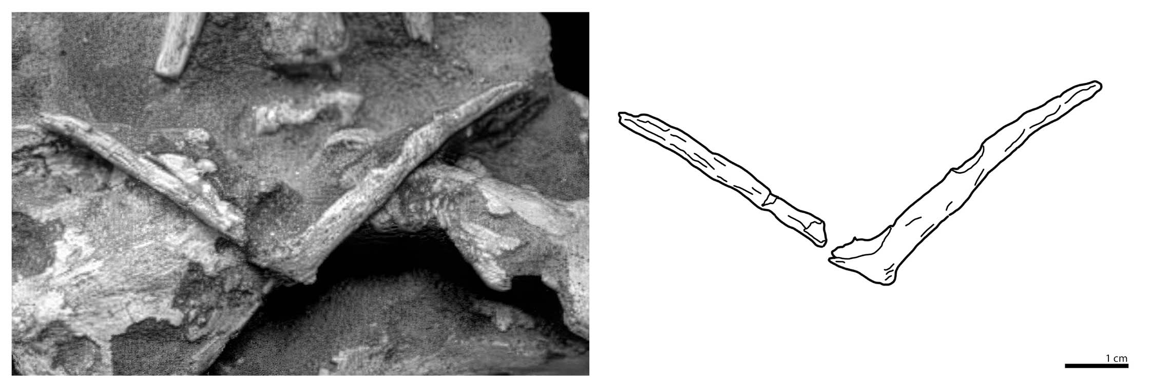 Pectoral girdle. It is composed of scapulocoracoids, the furcula (Fig. 7), and paired sternal plates. At least three ossified sternal ribs articulate with each sternal plate. The scapular blade is narrow and in lateral view widens slightly distal to the glenoid. The suture between the scapula and coracoid cannot be distinguished. Scapulocoracoids are arched all along their length and prominently flex at the base of the scapula. The coracoids are large, quadrangular, and flexed at the level of the coracoid tubercle, thus shifting the attached scapula onto the dorsal region of the ribcage. Each coracoid bears a large subglenoid shelf along the posterior edge. The furcula is thin, apneumatic, and its lateral rami are set at an obtuse angle to each other and are slightly arched along their lengths.